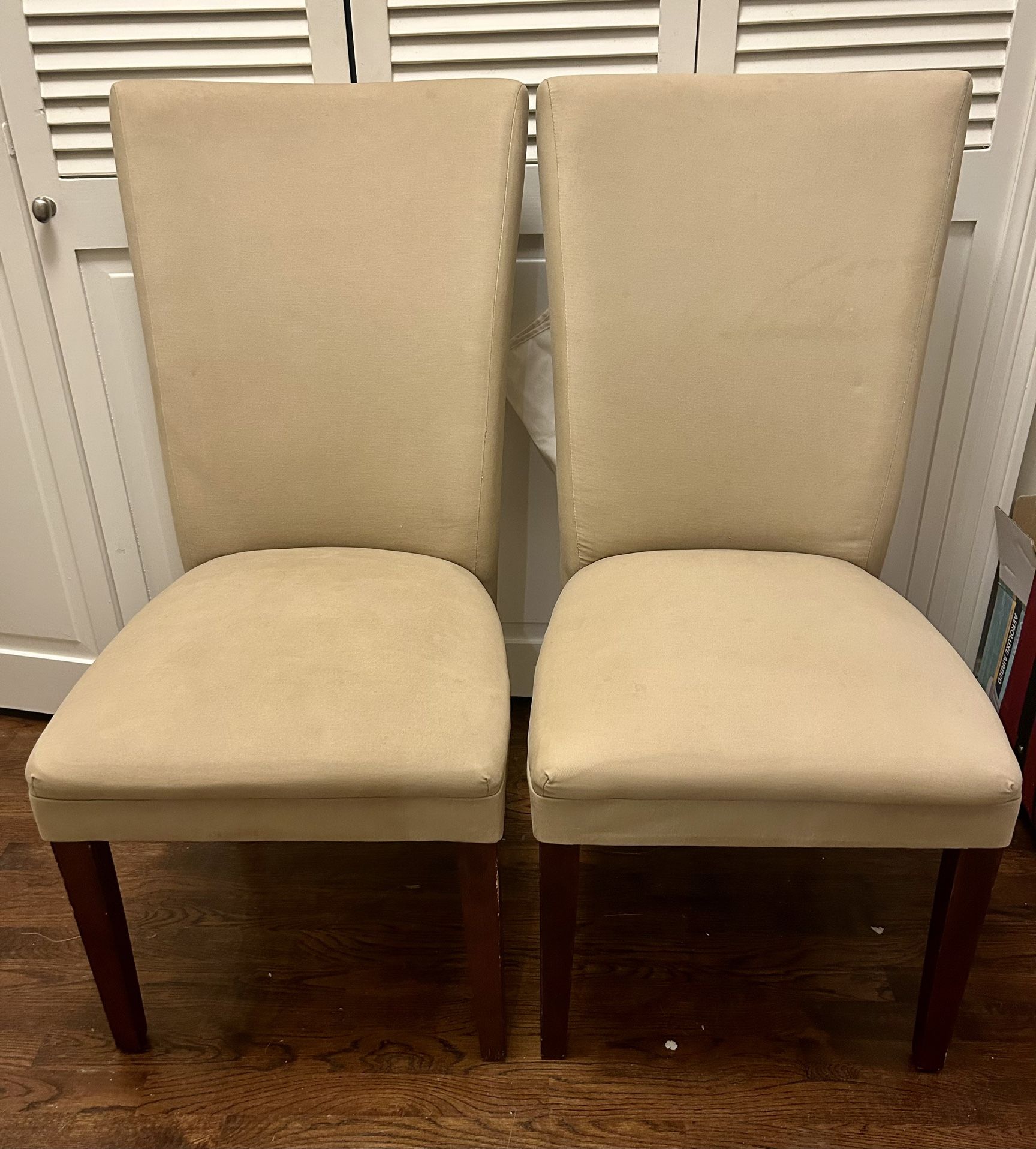 2 high back fabric upholstered chairs Bought these intentionally to recover with a fun printed pattern fabric but never got around to it so can be used as is or dress them up!