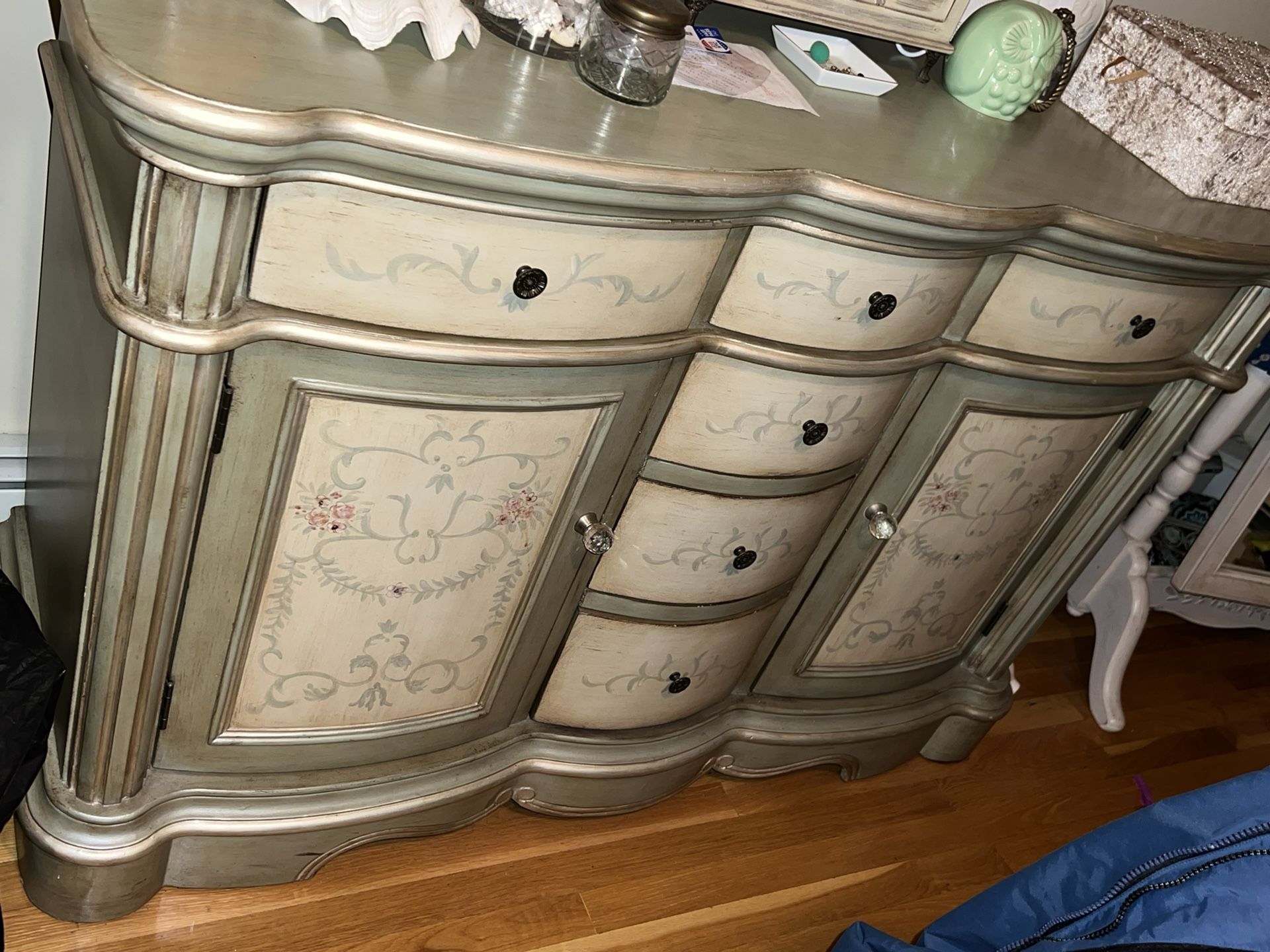 3 piece hand painted set - beautiful and spacious dresser, and large and small nightstand. All 3 come in a bundle. Everything is in really good condition.