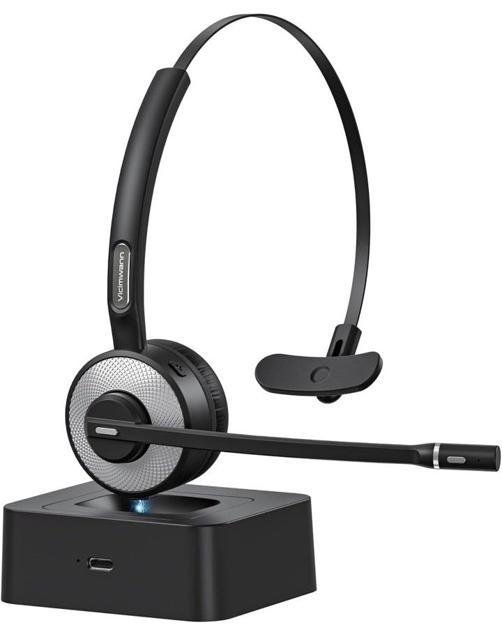 when you press the mute button. 【Pair with Multiple Devices】Some Bluetooth headsets may support a phone and computer connection only, while the M98B office headset with mic can connect to two devices — including cell phone, laptop, tablet, and iPad at once with multipoint pairing, allowing you to move freely between music, videos, calls, and more without skipping a beat. While listening to music or watching a movie on one of the connected devices, you can observe all the device's ongoing rings of calls or texts from platforms like Teams, Mail, etc., without having to peek at the screen. If your phone rings while you're in a video call on your computer, your connection will switch so you can take the call on your phone. 【Total Hands-free Control】When you need your hands to do your job, simply press and hold the MFB button of the headset with mic bluetooth for 1s and you can activate your phone assistant like Siri or Google Assistant to answer calls, make calls, send texts and emails, skip tracks, get directions, get recommendations and more for total hands-free control - all without ever touching your phone. 【Powering Your Long Shifts & Clutter-Free Effortless Charging】Take on any challenge with peace of mind your battery won't run out of juice during a shift. Laptop headset with microphone lasts up to 20h of music time or 14h of talk time on a single 2h charge. PC headset with mic wireless also comes with a charging stand. Simply rest the Teams headset on the base, and it charges it right away, so you are always ready for the next use. The dock is weighted so that it won’t slide around on your desk. Compact and unintrusive, the stand takes up very little space. You'll like the way the headset stands up during charging. You can charge the iPhone headset on the stand or plug the cord in directly.
