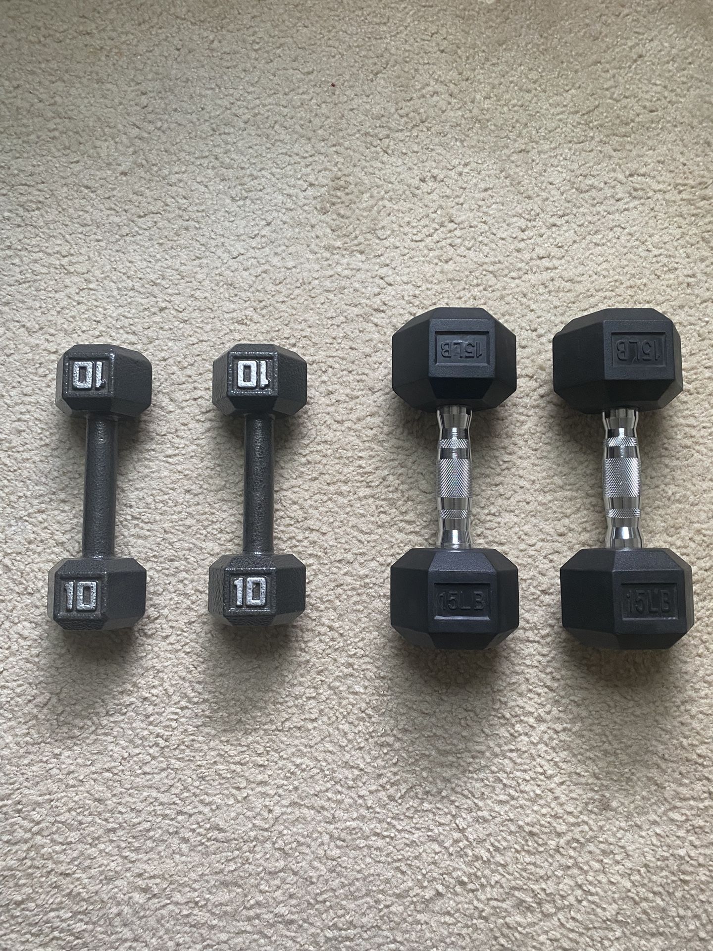 Dumbbells 10 lbs. Cast Iron weights 15 lbs Rubber Hex Dumbbells w/chrome handles