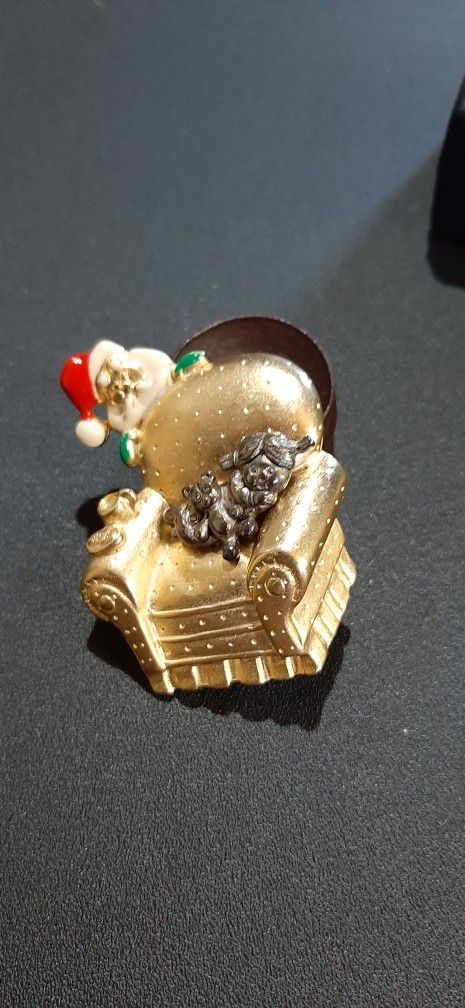 Absolutely cute pin...chair with little girl curled up waiting on Santa and Santa peeking over the back of the chair!! The enamel work is still in perfect condition!! The mark on the back is Danecraft Measures approx 2x1.5" I can ship for 7 I take venmo Cash if in person