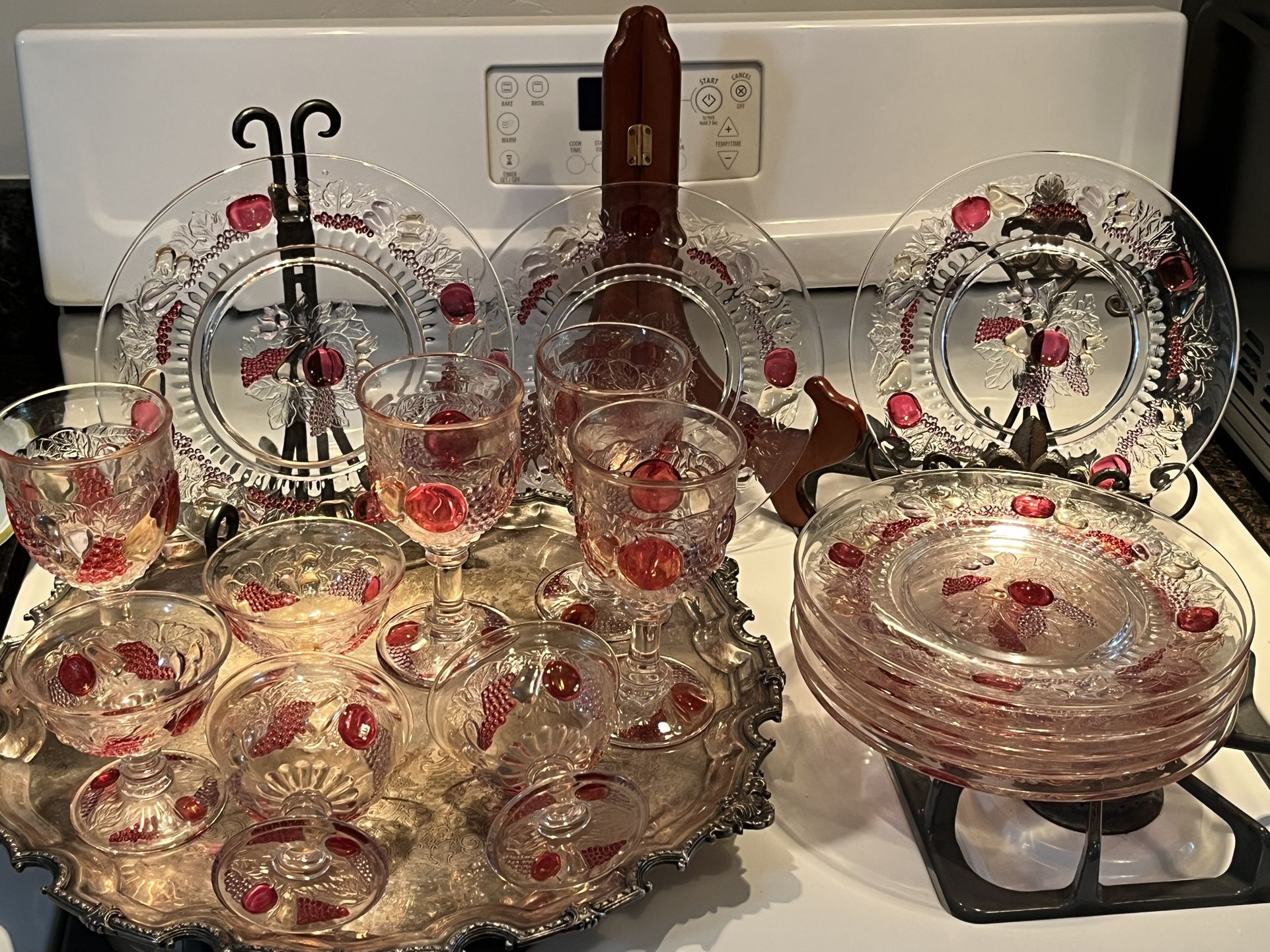 Absolutely beautiful. Would be fantastic for the upcoming holidays. You have 24 pieces. It’s in a three dimensional design. Eight plates, eight large water or wine outlets, eight champagne or dessert cups. Cash only, no money apps. Absolutely firm on price. Thank you for your interest