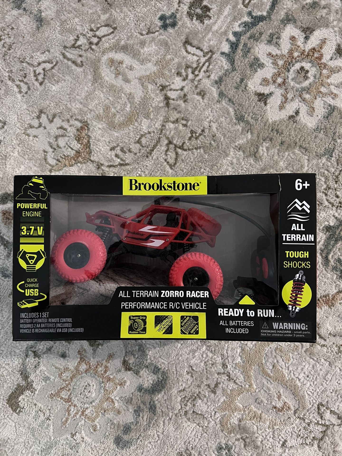 Never opened. Brookstone race car . Includes 2AA batteries and is rechargeable