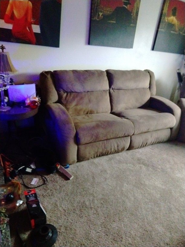 The sofa is a double recliner plus one recliner matching set total of three recliners in good condition there's no teas is used very large furniture cocoa brown corduroy fabric