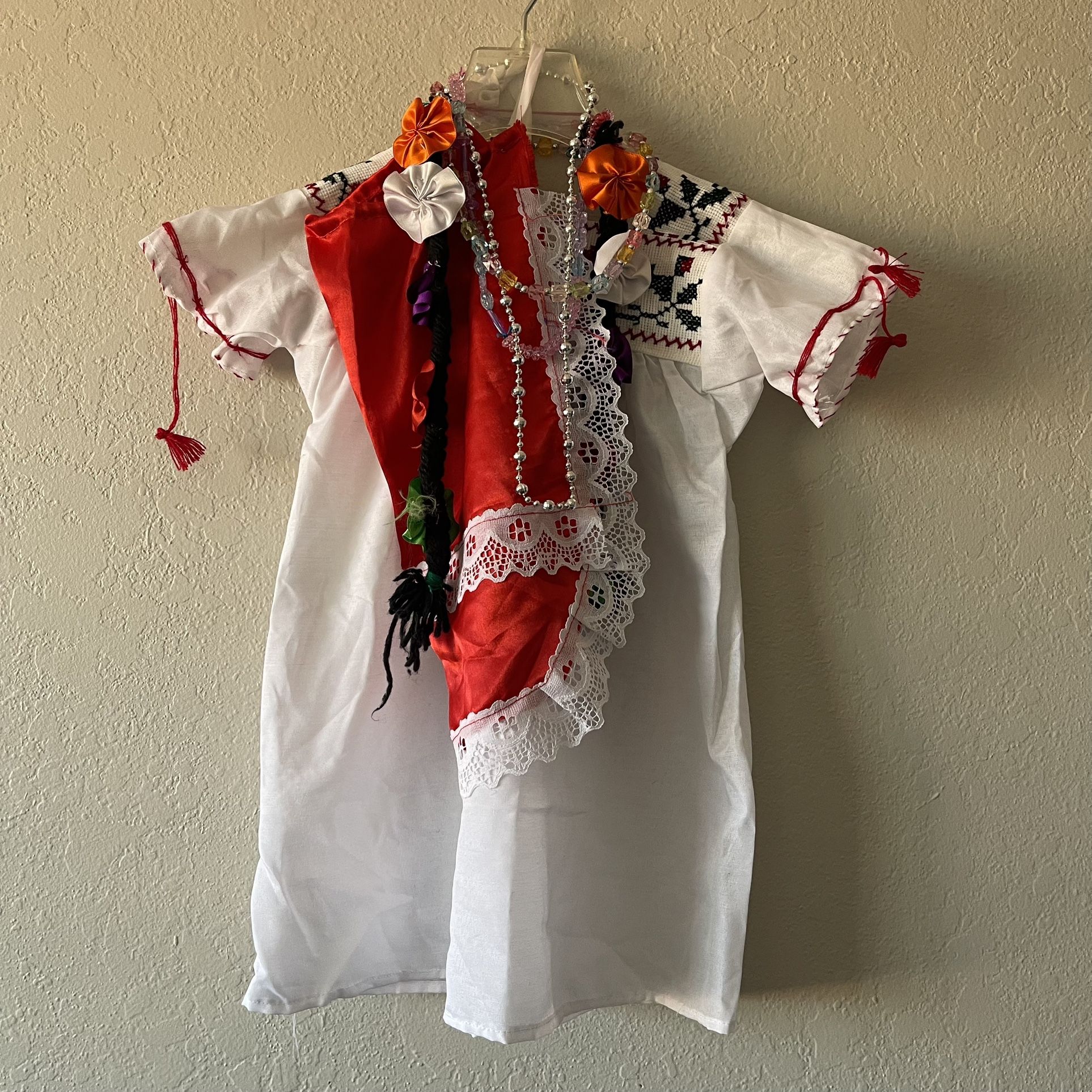 Set includes shirt braids necklaces and apron DOES NOT INCLUDE SKIRT El set incluye blusa, trenzas, collares, y mandil NO INCLUYE LA FALDA Chest 11 Length 21 SKU 509