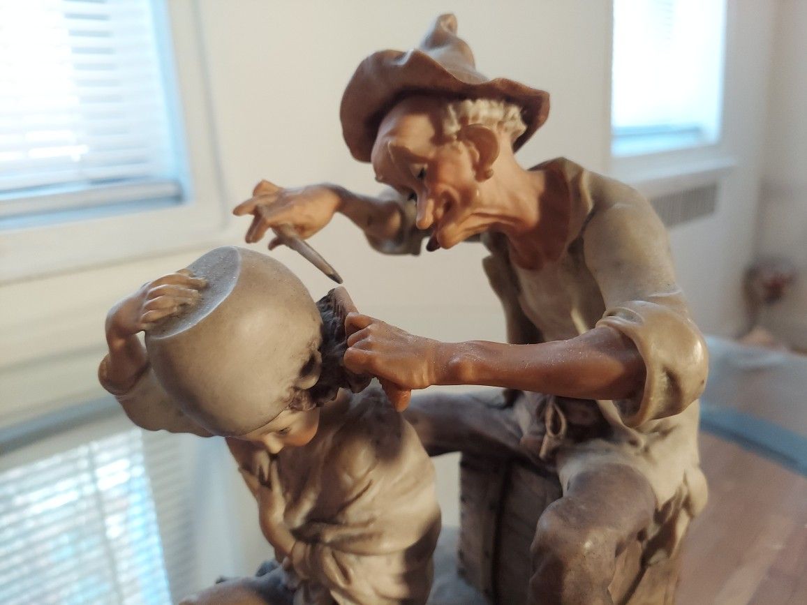 US ANTIQUES HANDMADE FIGURE: "HAIRDRESSER" BY SIGNATURE ARTIST. MATERIAL: PORCELAIN & WOOD** SIZE:12X8 INCHES. ** GREAT CONDITION **