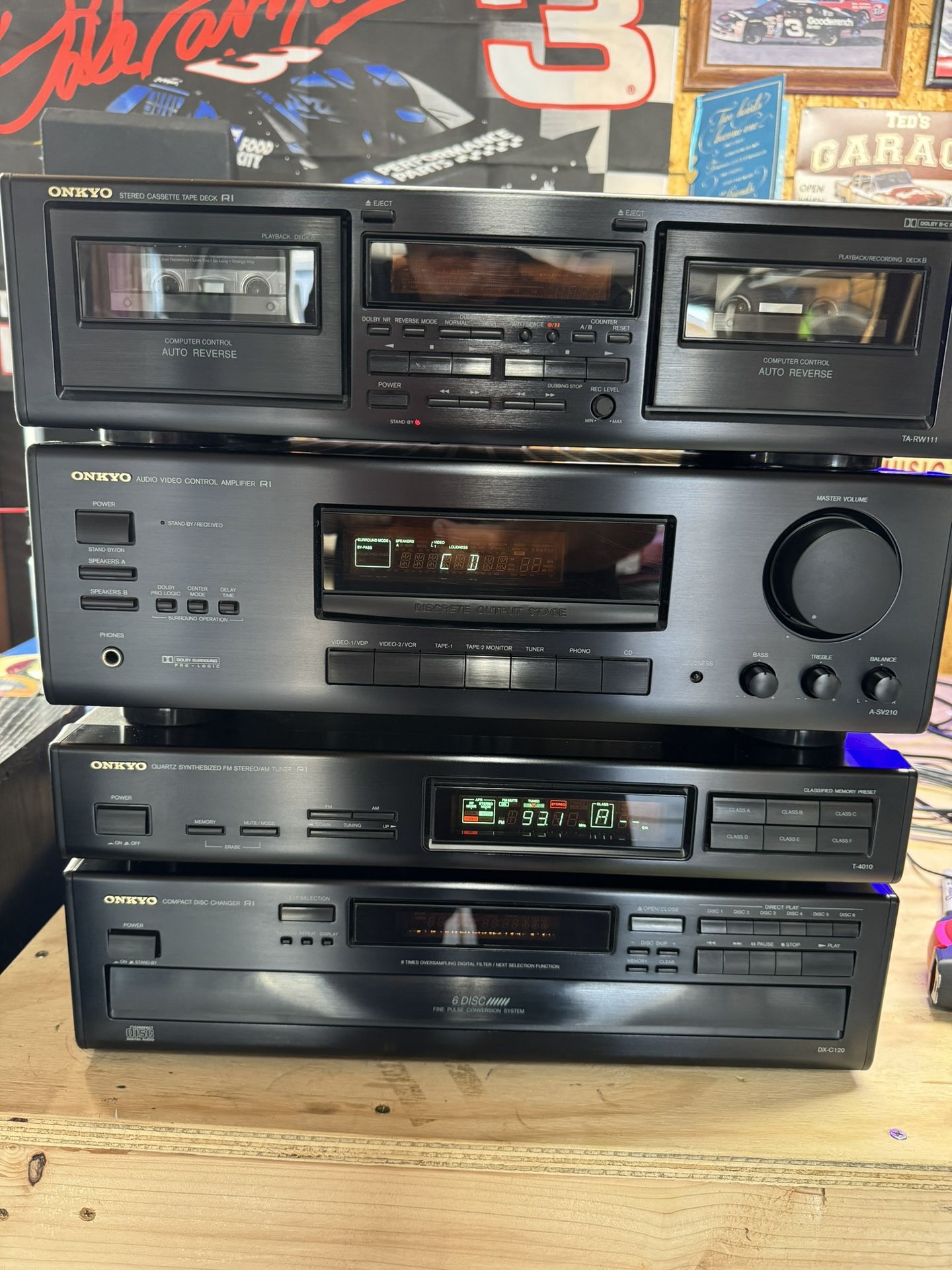 A Complete Mint Condition Onkyo Audiophile - Component System! (ALL Components Work Correctly! (Amazing Audiophile Sound Quality!! Includes- Remote Control-Amplifier ‘ with Builtin Pre-Amplifier A 100 Watts per Channel “. Tuner’ 6 Disc Carousel CD Player ( with 8 Times Oversampling Digital filter fine pulse Conversion system ) Also Cassette Deck Player with Dubbing for recording, Also Stereo Cabinet with Turn Table Slide out ALL IN MINT Condition