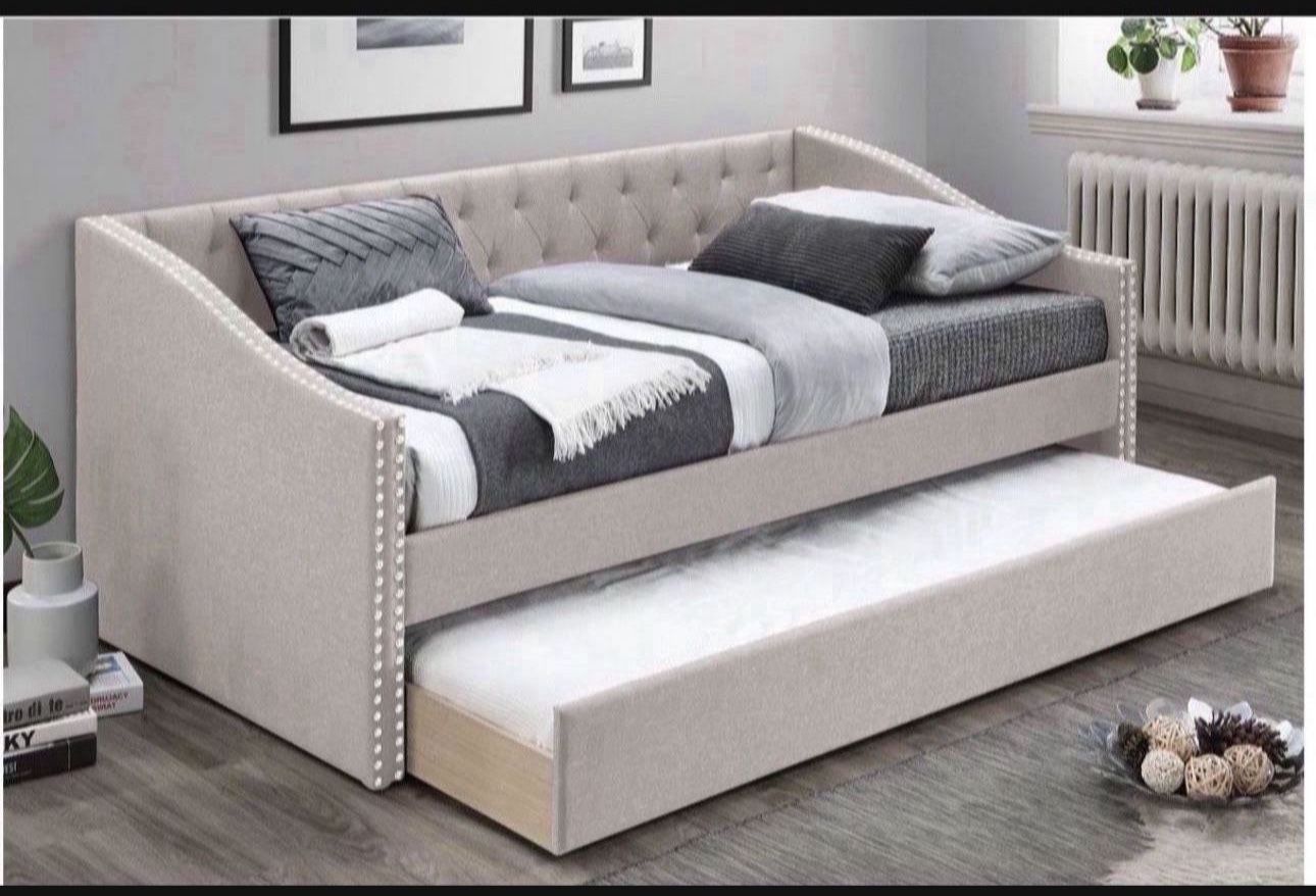 Brand New In box Day Bed With Slats and Trundle, and 2 mattresses Assembly required, (Day bed comes in 2 boxes) Blankets and pillows showed in the picture are not included. Dimensions of Daybed: 81" x 43" x 33"H Pick up in Long Beach or We can deliver for a fee F9455 Se habla español