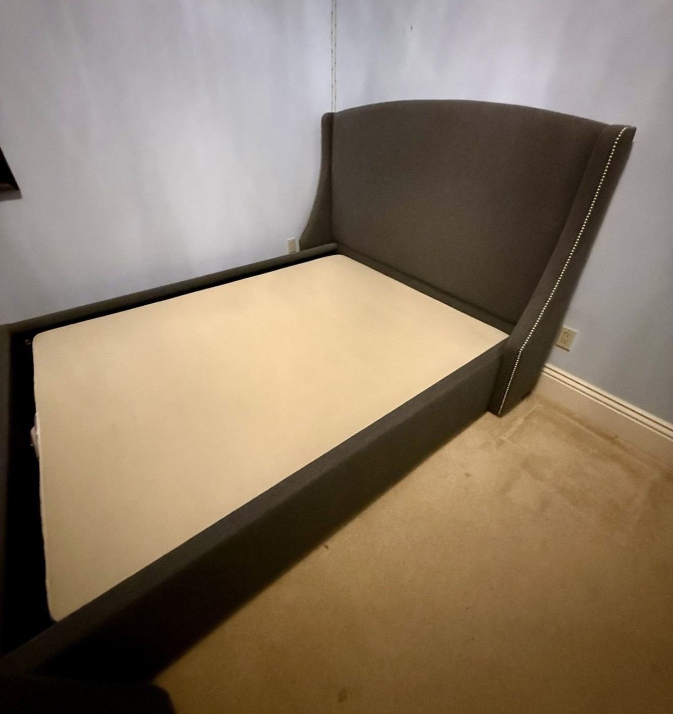 Pick up Woodinville. Bundle with other items & make an offer! Frame is disassembled for easier transport but a large truck is needed - please measure to ensure fit. Longest side piece of frame is 82” long. **Box/foundation is one piece 80” long x 5ft wide x 5.5” thick Headboard measures 6ft across x 54” tall x 14” deep YOU HAUL. Beautiful upholstered wingback bed frame in grey fabric with nailhead trim detail. Includes a Sealy box spring. ✔ Upholstered wingback headboard ✔ Nailhead trim accents ✔ Clean, solid condition ✔ Includes Sealy box spring ✔ No mattress included (Casper mattress listed separately) Great neutral style – works well in guest room, kids room, or primary bedroom. Structurally solid and ready for use.