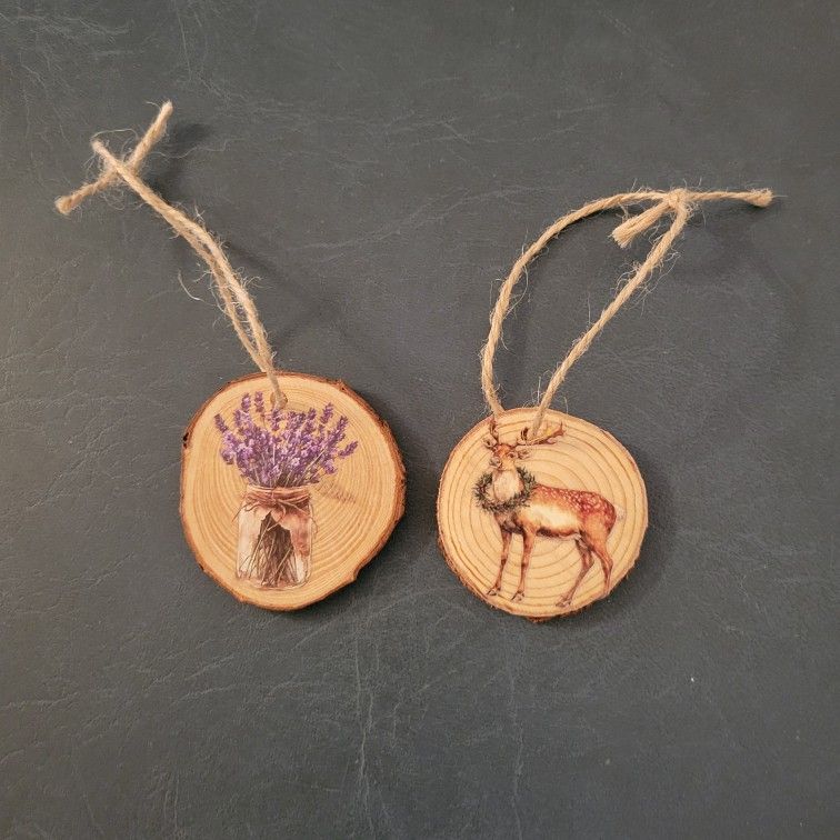 Set of two wood slice Christmas tree ornaments. A perfect match for your rustic decor! Each ornament is 2" in diameter and has a burlap string hanger. Brand new, never used, no scratches, cracks or chips.