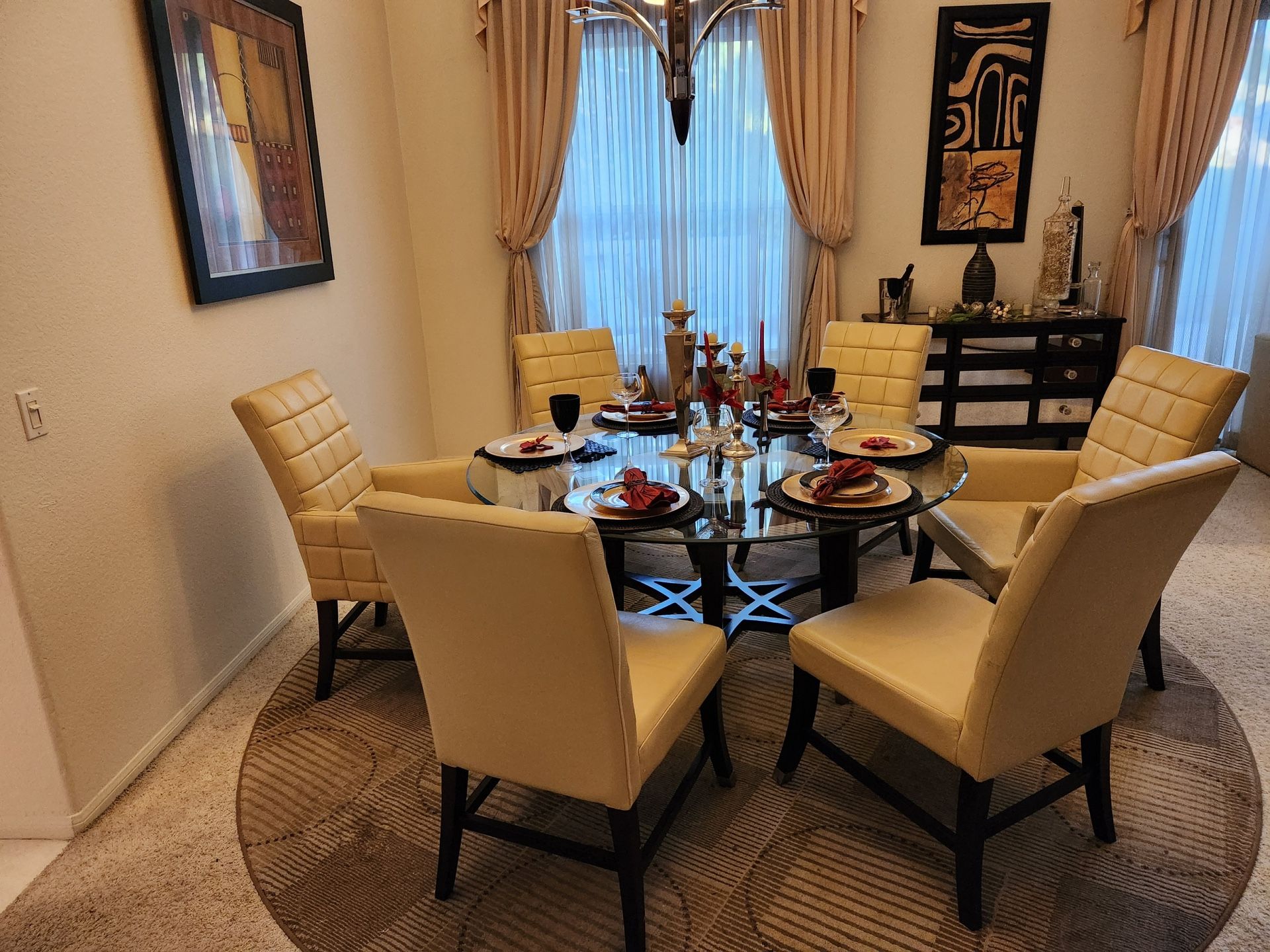 Glass dining set with six leather chairs. Great condition! From basset furniture