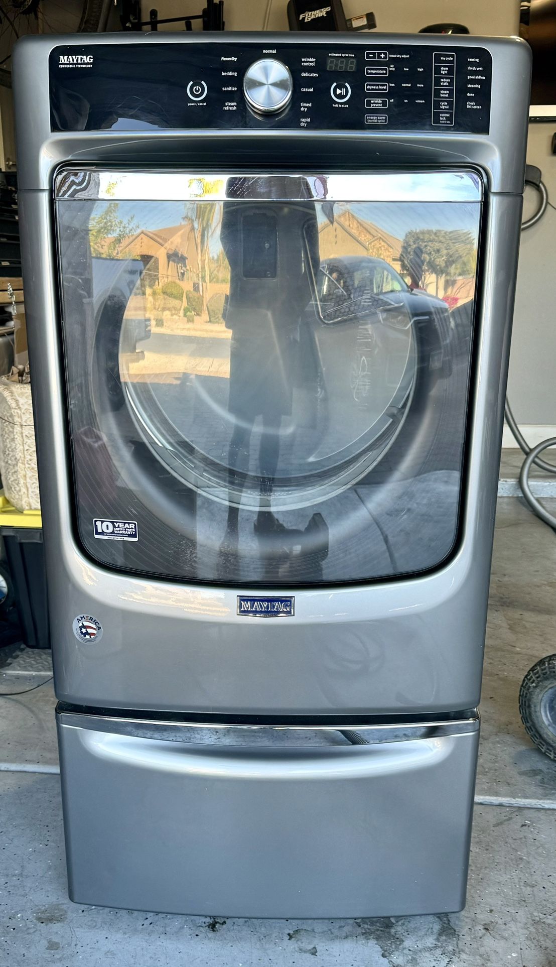 Runs great, new drum seals installed last year by warranty, very clean and great dryer. Switching to a natural gas same model. Has steam press, water hookup, multiple cycles, and power boost. All manuals included. Still under 10 yr parts warranty (6 years old) USA MADE. Original price $1,200 with $300 pedestal. Titanium. Could help deliver locally if needed. Maytag Large Capacity Dryer with PowerDry This large capacity dryer from Maytag features Maytag's PowerDry system to deliver even and thorough drying of even your largest loads of laundry. Powerful heat and optimized airflow dry faster, while Maytag's Advanced Moisture Sensing technology and an added interior fin help to get your loads evenly dried. This dryer is steam equipped to dewrinkle, deodorize and refresh your clothing items. When you need garments refreshed without a full wash, the Refresh Cycle with Steam revives your clothes and leaves them looking crisp and smelling clean - no wash cycle necessary. For heavily soiled items, the Sanitize Cycle removes 99.9% of household bacteria with extra hot water temperature, delivering thorough cleaning and peace of mind. Plus, Maytag's Reduce Static option assures that unloading your freshly dried laundry is painless - no more annoying shocks or static clinging. Despite its powerful drying performance, this model from Maytag is ENERGY STAR rated. You'll get all the drying power you need without the hefty utility bill. For a powerful, spacious and energy efficient home dryer, Maytag presents the MED8200 electric dryer, designed to cut time and effort out of your laundry routine without sacrificing drying quality.