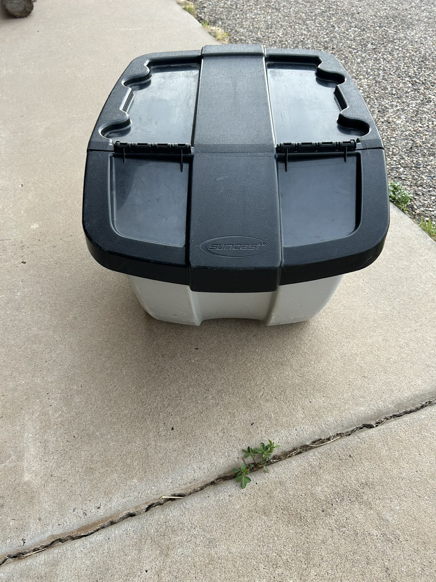 Suncast Large capacity heavy duty plastic storage bin with flip top removable lid. Dimensions: 17” h x 18” w x 16.5 d. See pic of hole in outer part of bin, lid covers hole.