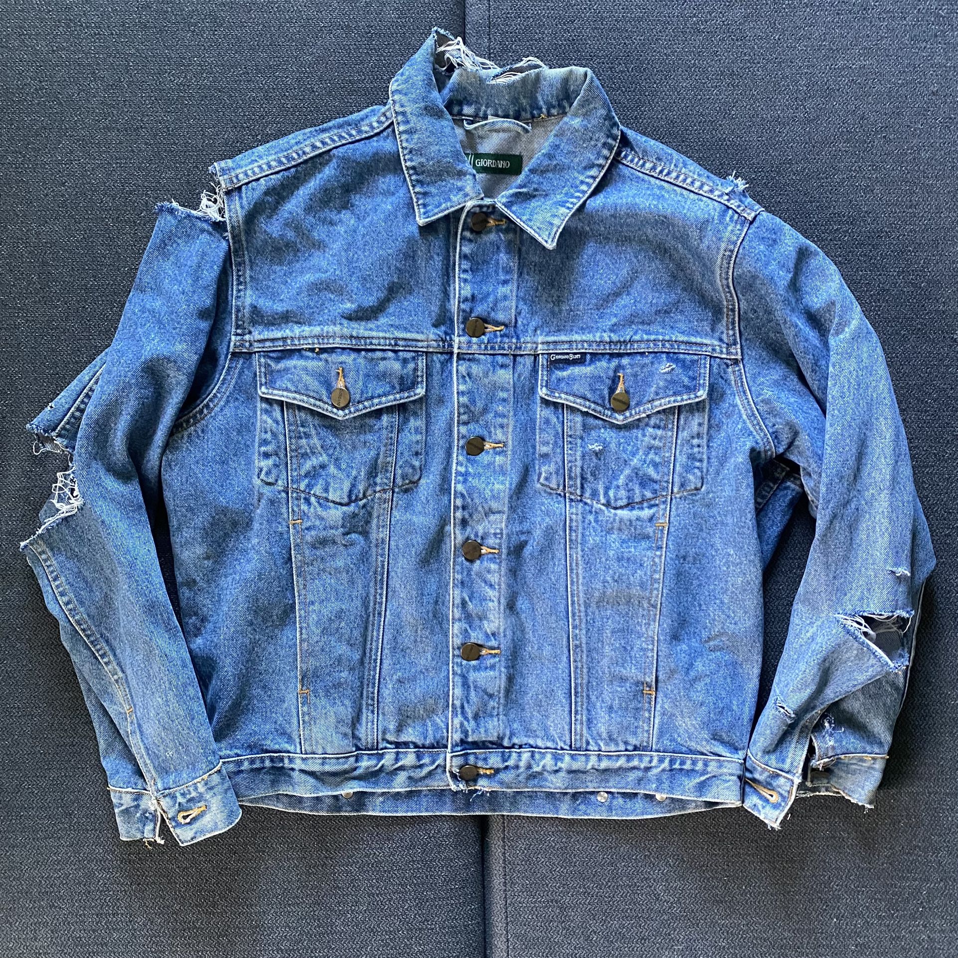 Ripped “Distressed” Jean/Denim Jacket Size: fits Medium! Condition: ripped lol (has stains as shown on the last pic! Please look at all the pics carefully)