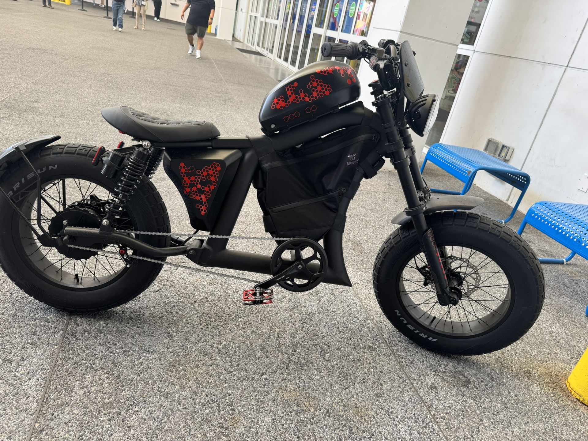 Selling my Custom E Bike - see the last pictures posted pedals and cranks were taken off, - needs brake alteration goes approximately 40 miles in speed and can go up to between 50 and 60 miles before it needs to recharge takes about 4 to 5 hours to recharge lots of extras!! Super fast and extra fat tires comfortable seat perfect for anyone 5’7 to 6’4 tall. It looks like a motorcycle and it gets a lot of attention since it’s quiet offers pedal assist alarm with motion detection and key also The center black bag over $150 is great for storage only 120 miles brand new! Red sticker on tank can be peeled off. You can add whatever you’d like to change the design! Price is slightly negotiable, but not much since I’ve received many inquiries have to sell because I’m moving into a smaller apartment and don’t have space come check it out in Fort Lauderdale, Florida, Las Olas water garden condominium