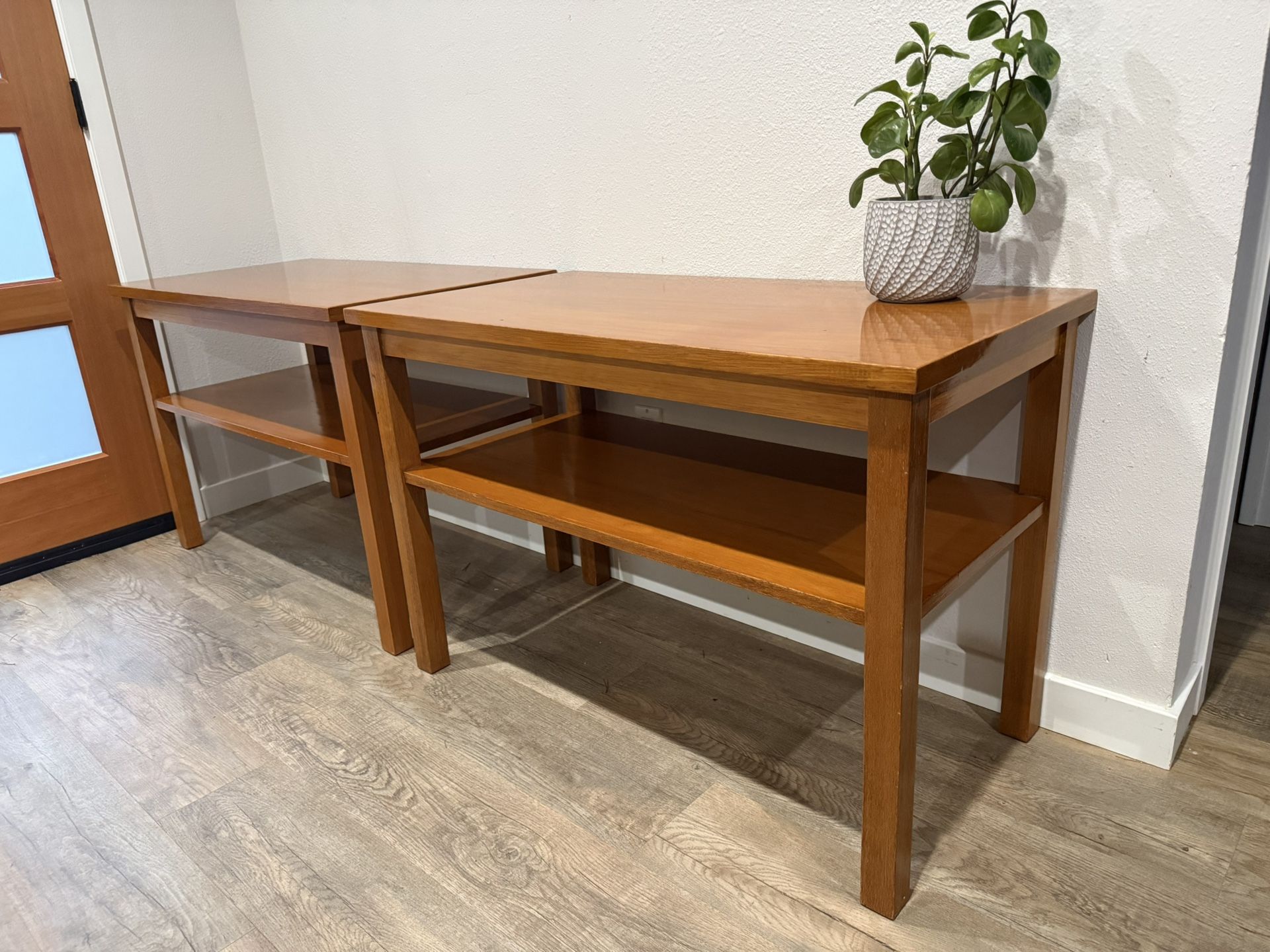 in wide by 20 3/4 in deep by 27 in tall. the fixed lower shelf is 16 in off the ground. These beautiful and useful side tables were custom built to fit a bedroom where the occupants wanted luxuriously large nightstands. The finish is in good vintage condition with minimal signs of wear. They have utility in many places, as end tables, side tables, consoles, or sofa tables. due to the fixed lower shelf, you cannot push a chair underneath them. Fantastic storage and display. Delivery available for a fee based on distance, and a deposit via Venmo or cashapp is paid prior to delivery. See my other listings for more found treasures, reimagined favorites and mid-century gems! Living room, family room, media room, library, storage, bedroom, 2 nightstand, well made, sturdy, guest room