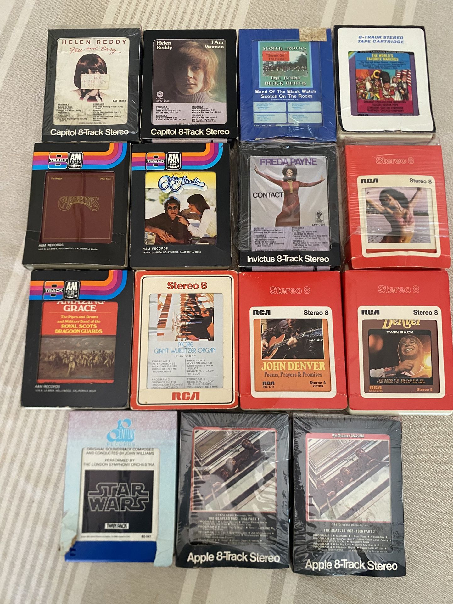 (15) Eight Track Tapes, all have track tape inside except for Beatles 1 as you can see in the pictures, all have 8 track jackets, comes with Vtg box that has 24 slots to holds tapes, for the music enthusiast or anyone who wants to collect vintage, tapes: Beatles, Star Wars, Helen reddy, John Denver, to name a few, see pictures