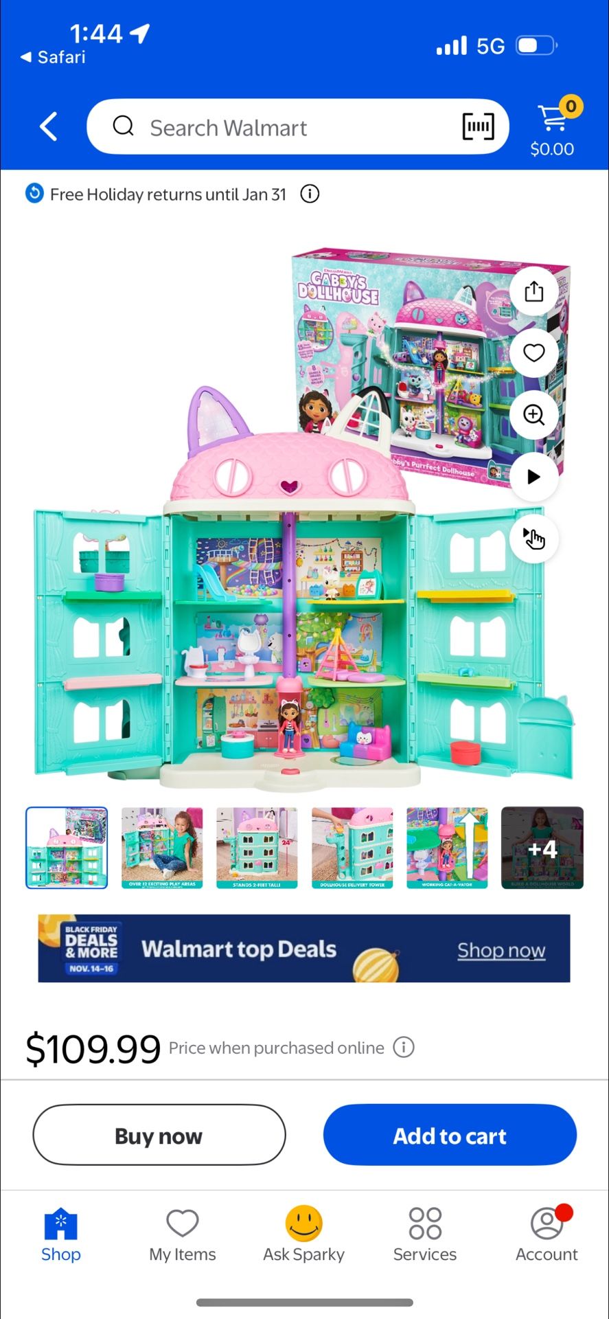 I have a gabby doll house available. It’s in good condition and nothing is broken. Pet and smoke free home. Sells new for 109. Asking 50. Come check it out.