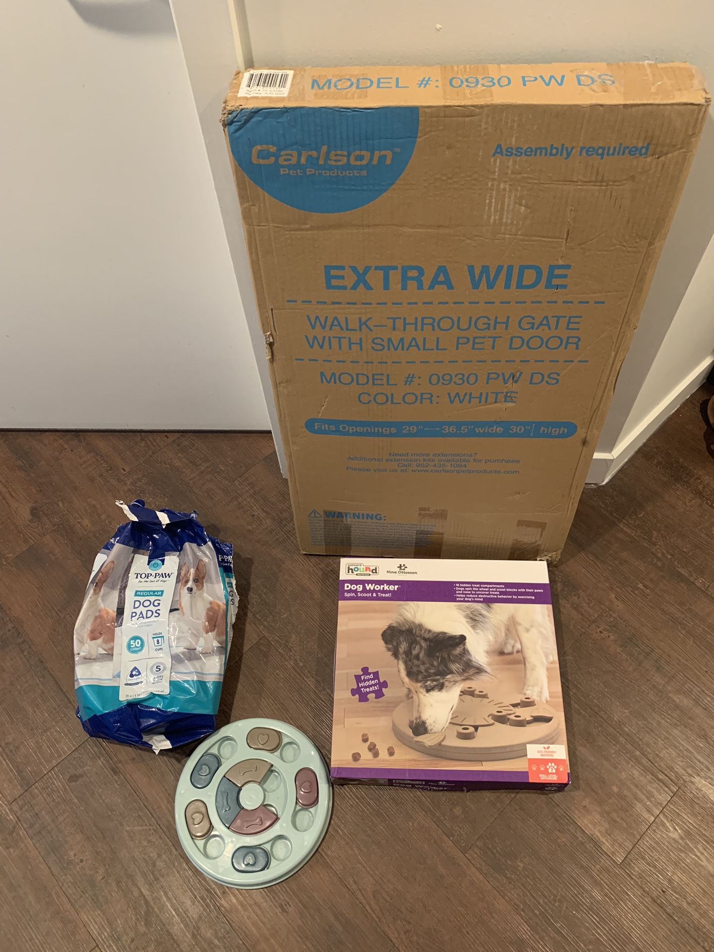 Dog gate is brand new, never used. One big food puzzle in the box, was used once. Also included a smaller food puzzle. Lastly throwing in an open box of pee pads, originally had 50 pads, around 20 or so left. Pick up at the yard: 1600 Alden Rd, Orlando 32803