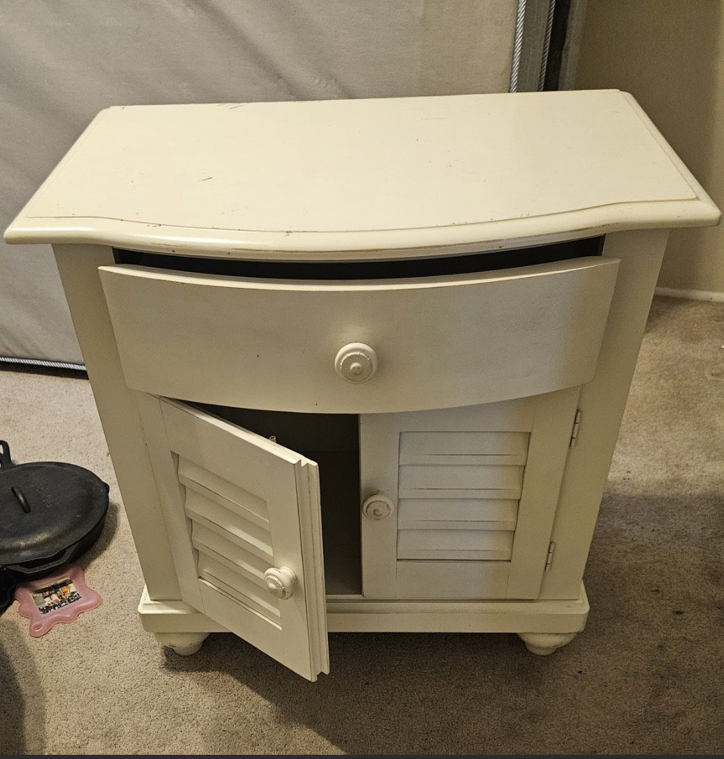 White wooden cabinet with one drawer and two doors. Could use paint touch up. 27.5 tall 28.5 wide 18.25 deep