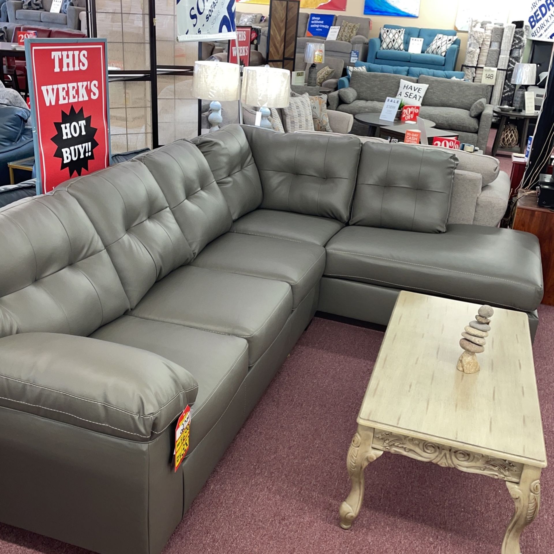 Brand New Faux Leather Gray Sectional! 🔥$1,299.99 Cash Price🔥 OR $50 Down Takes It Home! Balance set up on auto pay. No Interest If Paid Off In 90 Days! Add Tables and Lamps To Save Even More! Pickup or Delivery Available To All Of The 757 Check out all of my deals on brand new furniture! Sofa Sectionals Bunk Beds Mattress Sets Dinette Tables and Much Much More!