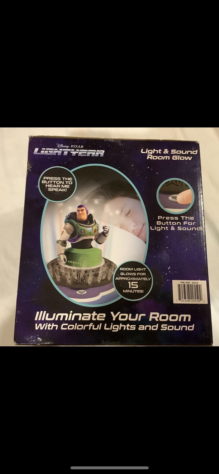 Buzz Lightyear spins and makes signs while glowing around the room as a projection lamp. It lasts 15 minutes per button press. New in the box.