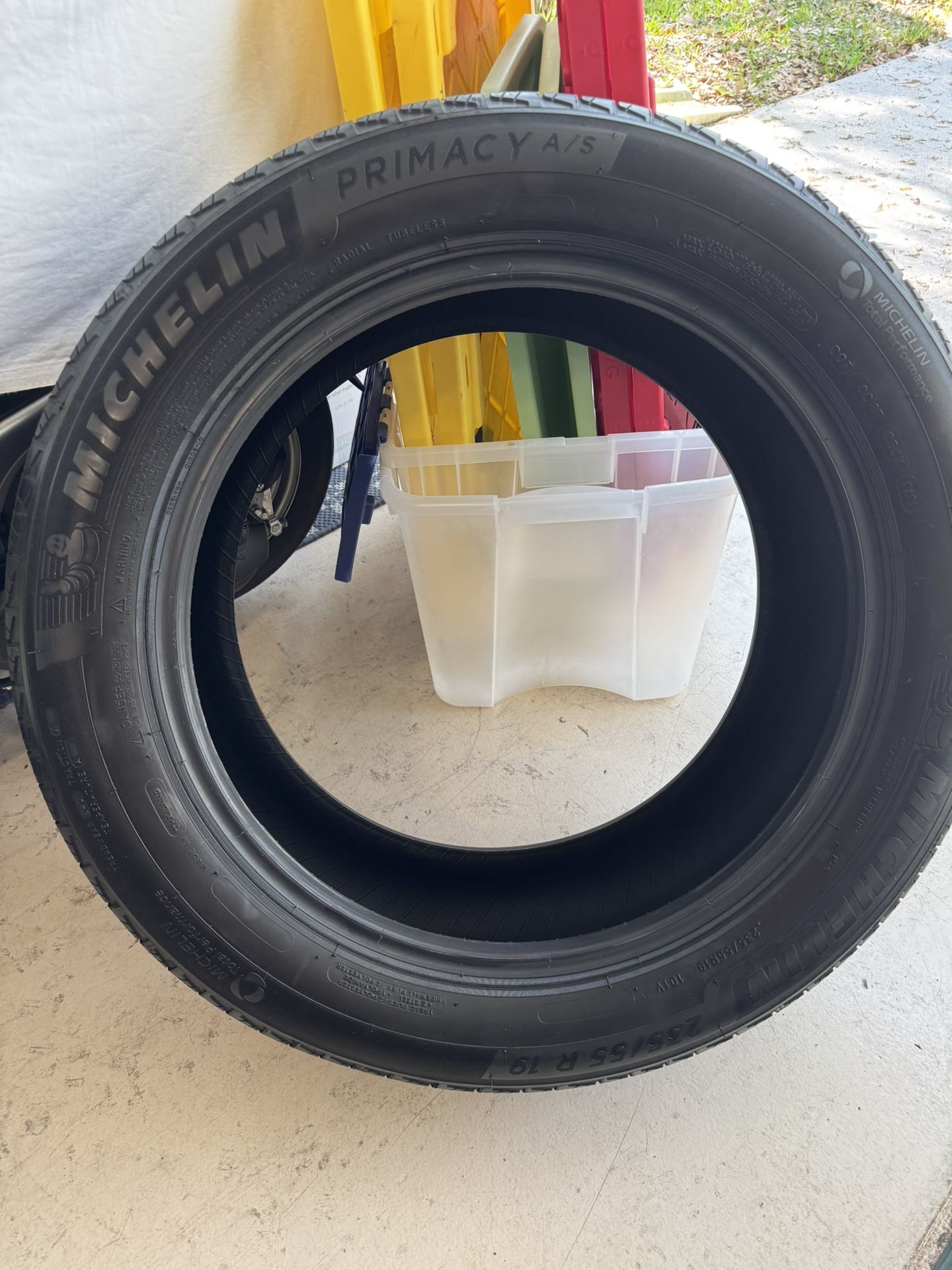 Michelin primacy 235/15 R19 used tire. Has 16.5K miles and good tread remaining. No previous abrasions, bubbles, cuts. 01/2021. ,