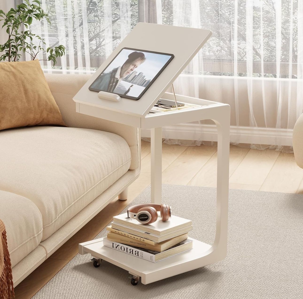 C Shaped End Table for Couch, C Table with Wheels, Wooden Couch Table Adjustable Desktop for Living Room,Bedroom(Cream White)