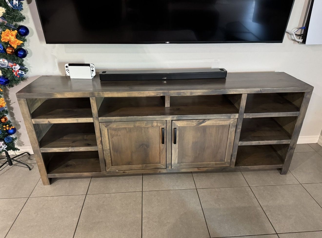 Gently used, about 3 years old. Solid wood, and in amazing condition!! Very sturdy. Entertainment center is from Living Spaces. Goes for $995 new. $350 OBO Shoot me a message Dimensions: 84.125"W × 16.875"D × 32.375"H