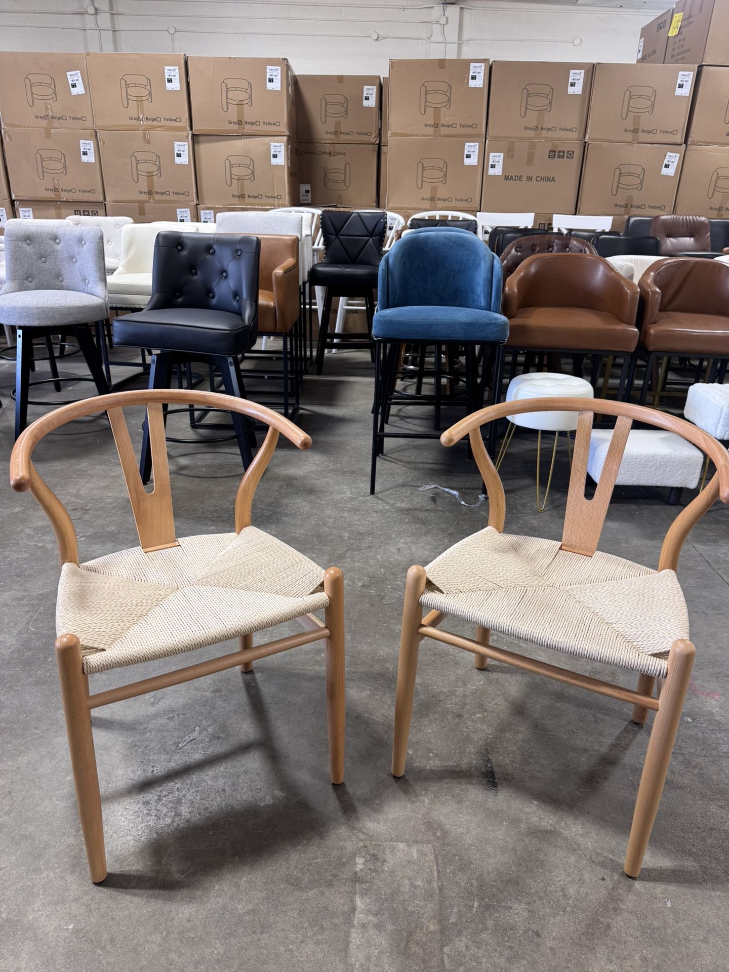 No Assembly Needed Modern solid wood dining chairs with woven rope seats. Sturdy, lightweight, and comfortable. Scandinavian / wishbone-style design that fits dining rooms, kitchens, cafés, or Airbnb spaces. Details: • Set of 2 chairs • No assembly needed – ready to use • Solid wood frame • Hand-woven rope seat • Stable and durable Condition: New / showroom condition 📍 Appointment pickup only