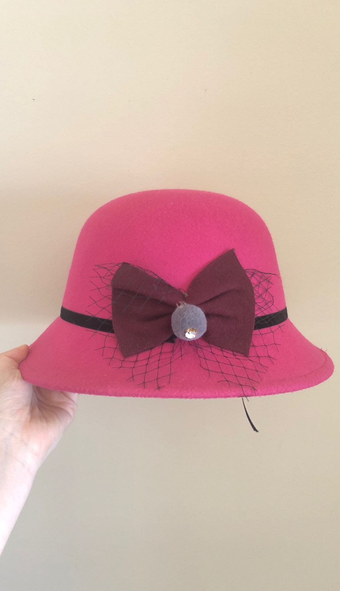 Pretty lady hat. Hot pink color with bow tie. Also size is adjustable.