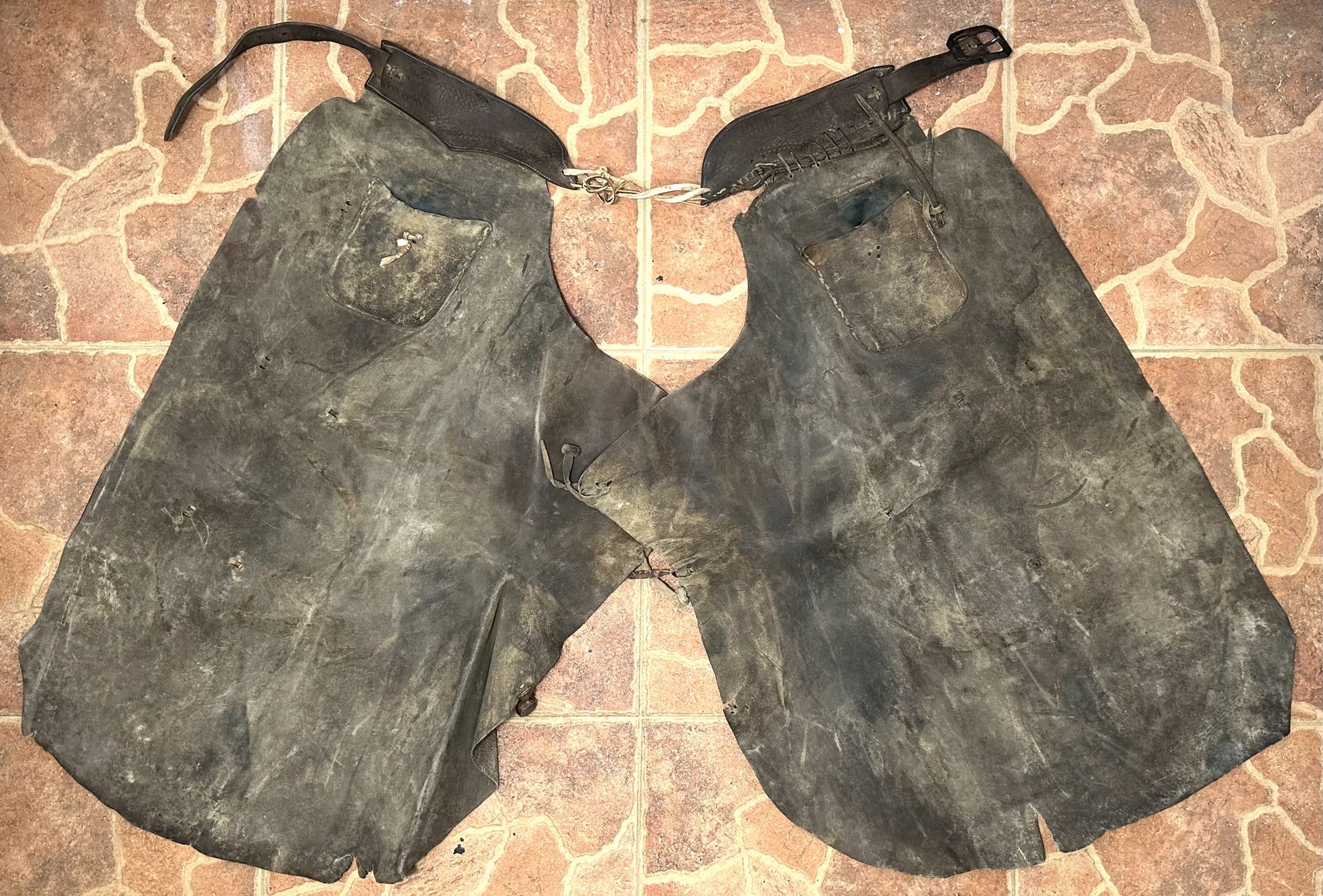Includes Chaps Only - Details Western Cowboy Chaps Vintage year unknown Brown Leather Batwing Style Adult (size unknown) - Selling for parts or restoration - Heavily worn condition (refer to photos) - Some minor wear may have been difficult to capture in pictures - Has some rips, tears, holes, stains, aging, dirt, hardening leather in some areas, etc. - All items on our site are pre-owned, regardless of condition (new, used, or for parts). - High-value items may require signature confirmation upon delivery. - Wear refers to normal damage or aging from regular use. - J1 - I44-4624-E
