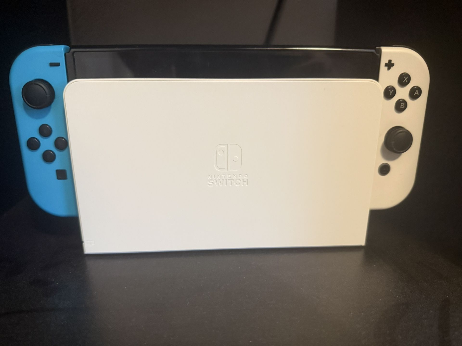 Owned by adult. Replaced with blue joycon because the original left joycon bumper (included) stopped working. Fixable if you open up the controller and realign the components. Nintendo Pro Controller Included Soft carrying case included. Dock included. Nintendo charger included