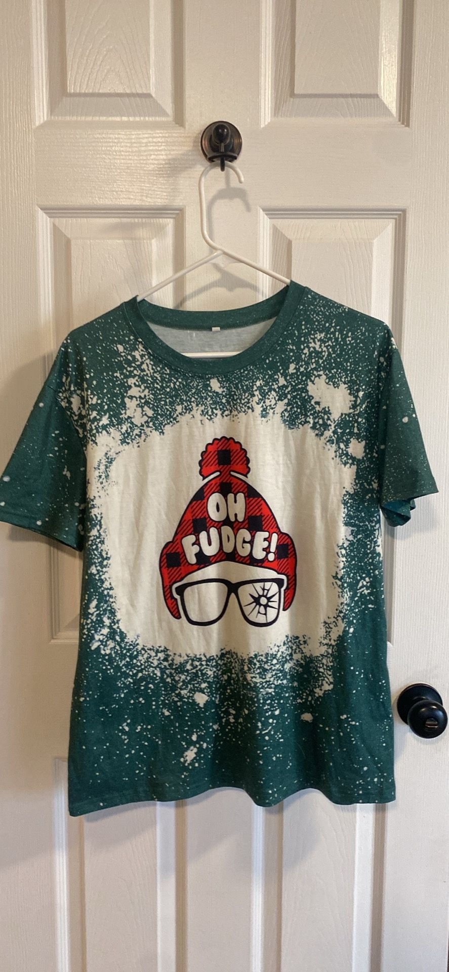 Christmas T-shirt, men’s large. Green with beige and a red and black plaid winter hat with broken glasses that says “OH FUDGE” it resembles the kid from the Christmas story