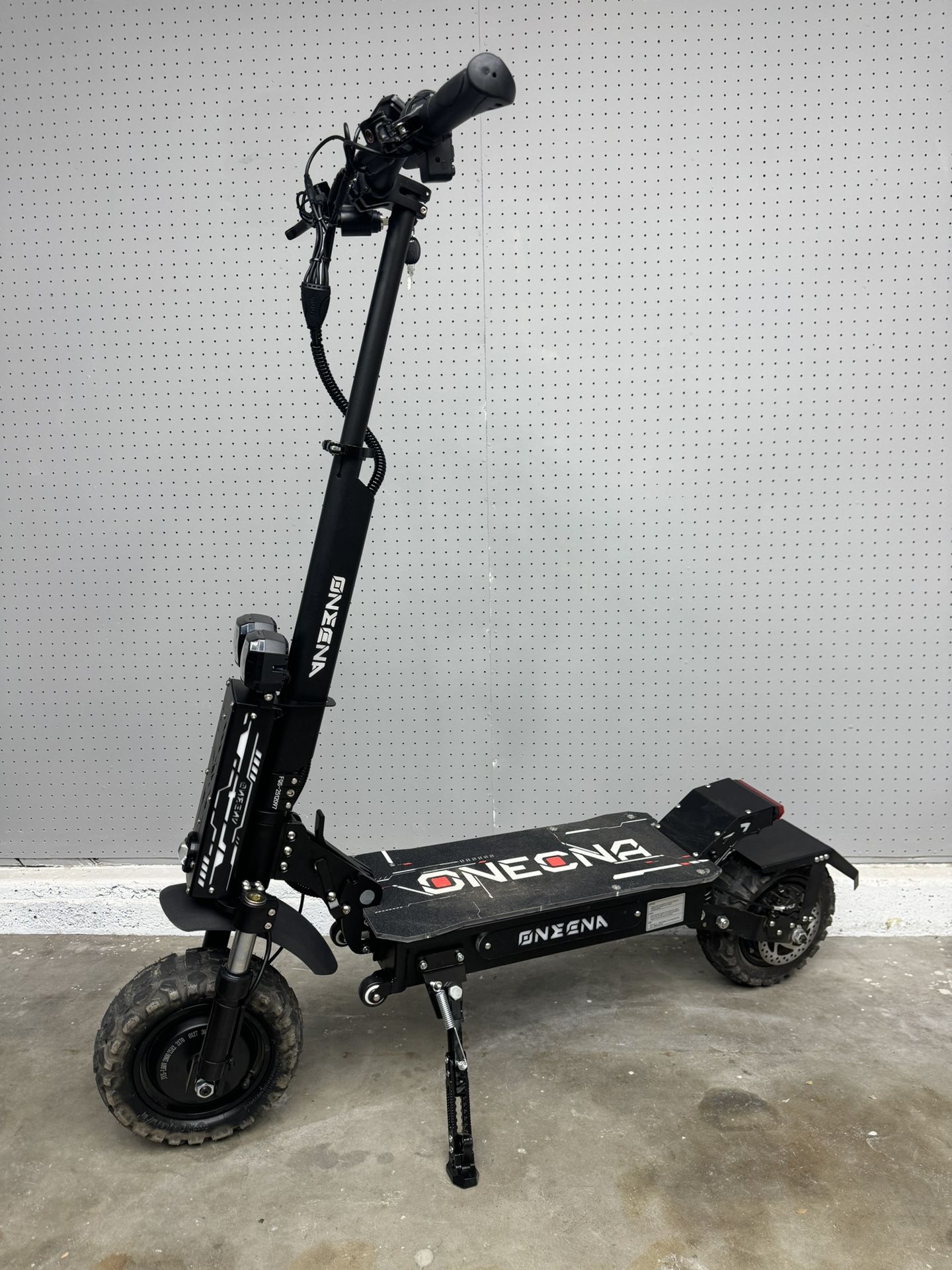 Onecna GT7 dual motor electric scooter eScooter. Specs: 5600w dual hub motors (2800w each) 42mph top speed 60v 27ah battery Up to 55 miles of range 11” all terrain tires Hydraulic brakes with 140mm rotors + EABS Hydraulic front fork + rear mono shock 8.9” x 20.3” deck size 3 headlights, taillight, brake light, turn signals 360 LED frame lights 80lbs total weight 550lbs max load Comes with optional seat, phone mount, bike lock, tools, 2 chargers and manual. This scooter was used once and only has 11 miles on it. It’s practically brand new. CASH ONLY. NOT LOOKING TO TRADE.