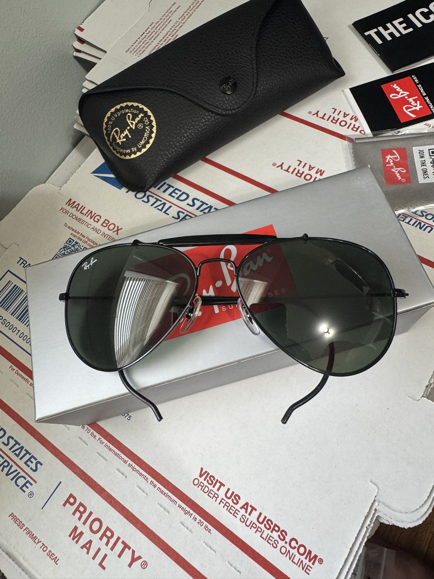 Rayban outdoorsman New never worn. Flawless. Vintage style! Very Stylish sunglasses. Unisex. Case, box, booklets and cleaning cloth included. Selling them at a great price. Will make a great gift!! Retail over $188 Serious inquiries only and No low offers please. Feel free to check our shop for more sunglasses models! Thank you!