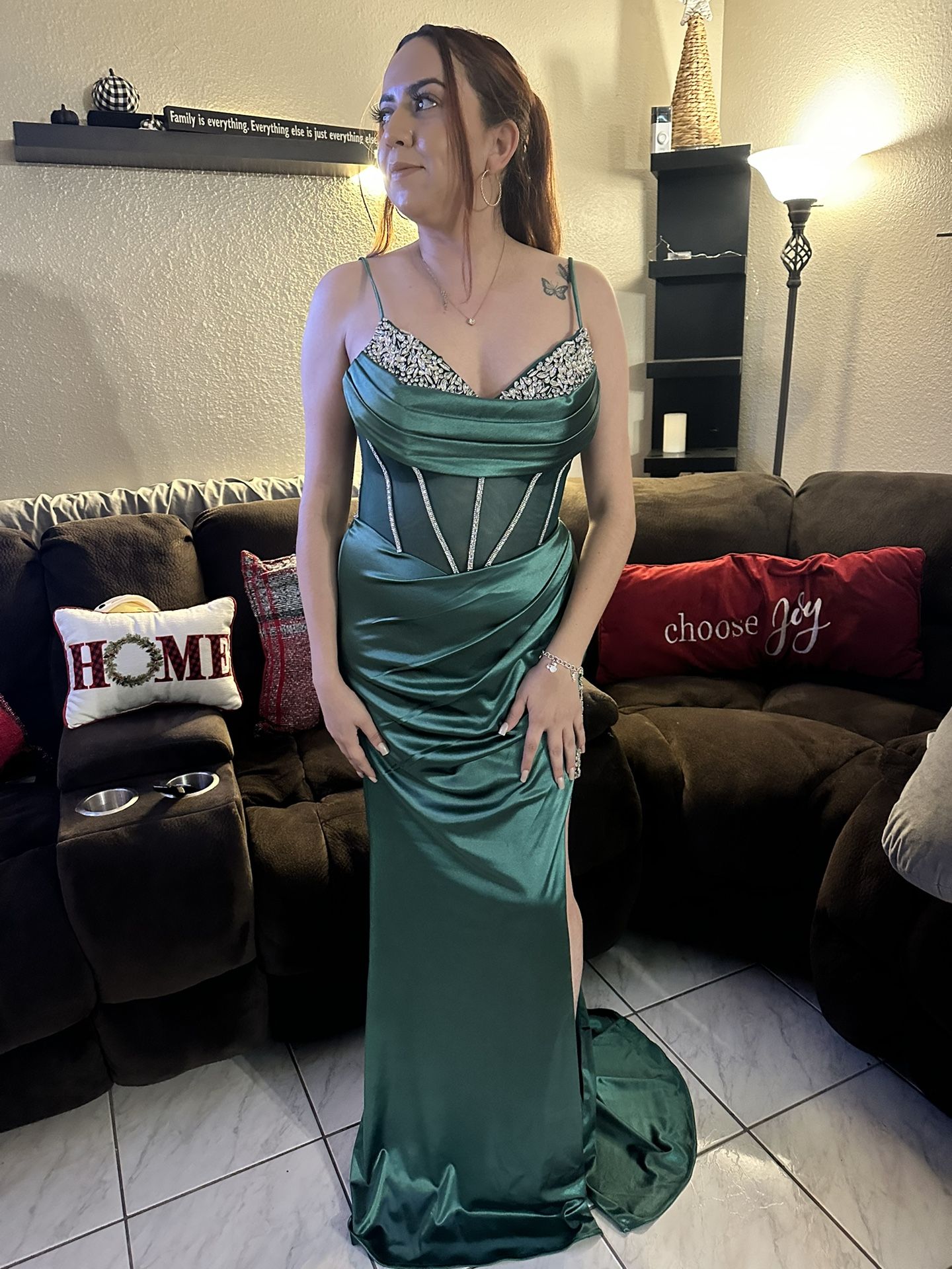Beautiful dress never worn Green Emerald Size Large Rhinestone slit Rhinestone bra corset