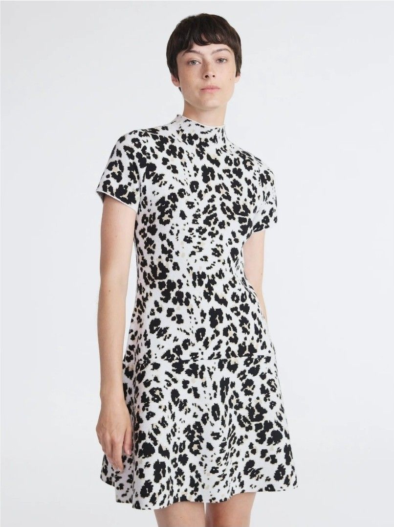 Scoop Women's Flare Leopard Jacquard Sweater Dress Size XL(16-18) or XS 0-2 New With Tags! This Dress is crafted in a Luxe Jacquard Knit 53% Polyester 30% Viscose 17% Nylon for a soft and comfortable feel. Pullover for easy dressing. Features a Mockneck, fit and flare silhouette, and clean finish edges.