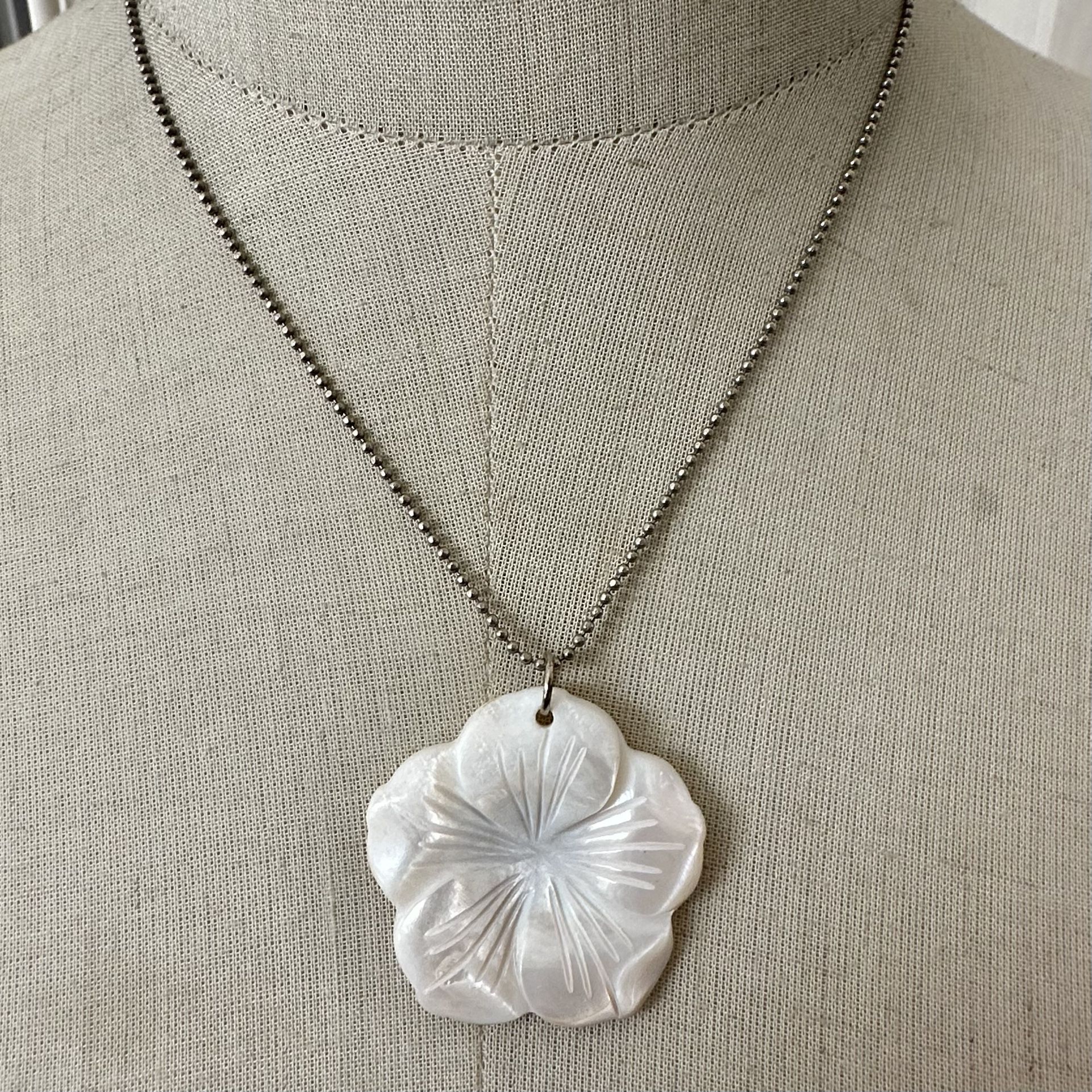 Mother of Pearl flower pendant necklace carved Great condition Lobster clasp I have lots of other pearl jewelry listed Silver tone chain Very open to reasonable offers - I always try to accept offers or counter or work with you on an amount that works for both of us :) Check out my other listings - lots of jewelry!