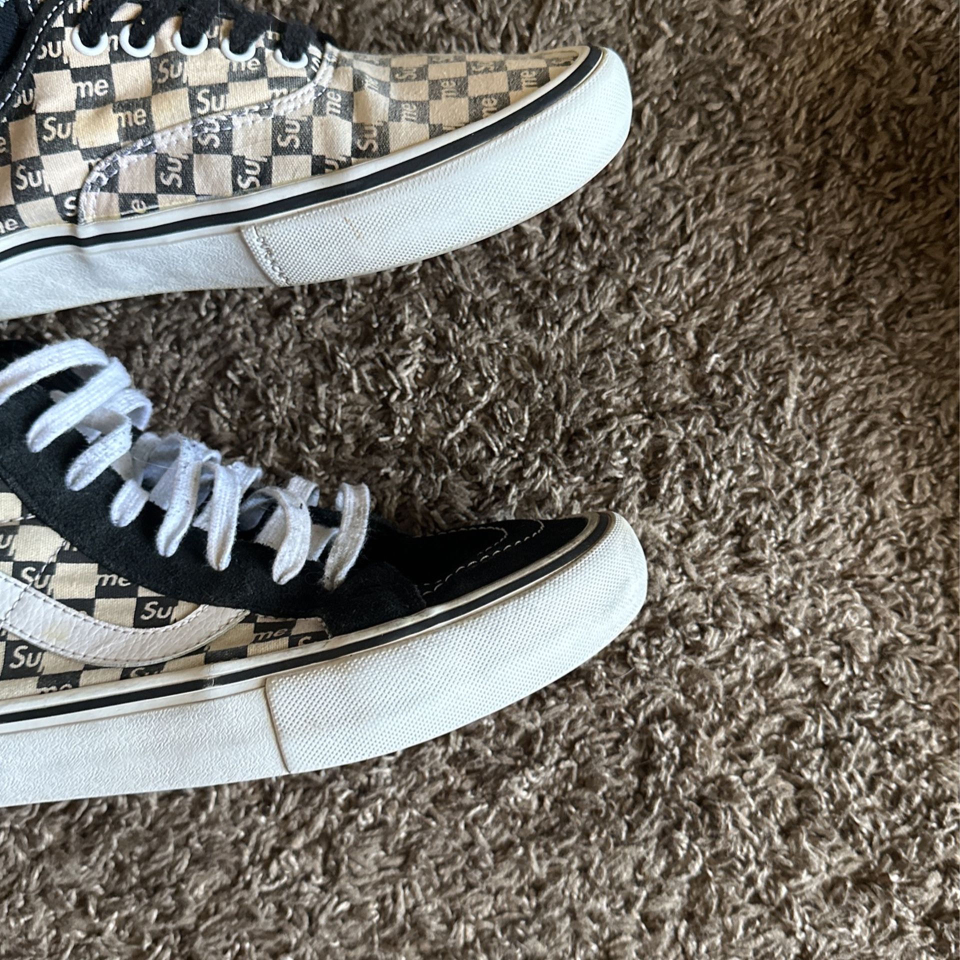 I have both Checkered Supreme Vans collab in black normal wear SUPER RARE AND DOPE COLLAB NEVER SEEN AROUND SI :10 Men’s both 400$ 1 pair 700$ 2 pair