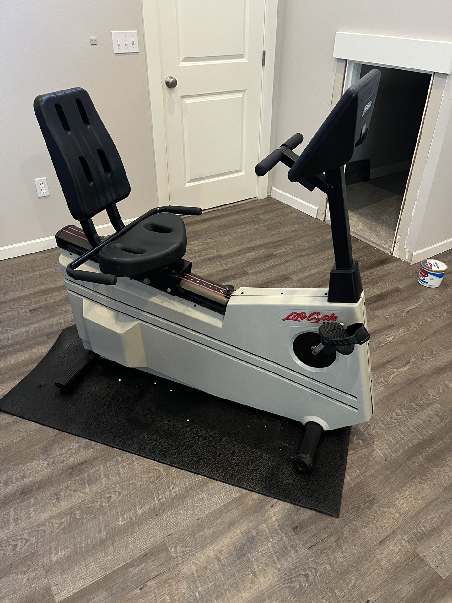 Like new commercial recumbent bike. Very little use. Includes floor mat.