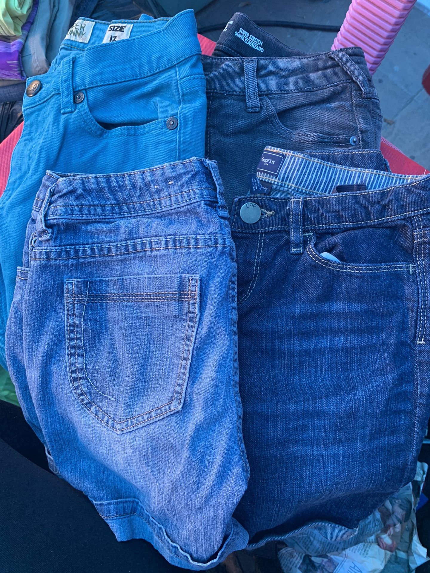 Nice 2 pairs of jeans black destressed girls jeans And 2 pairs of jean shorts light and dark color. I have much more girls clothing a lot of Justice clothing 4-$5 each