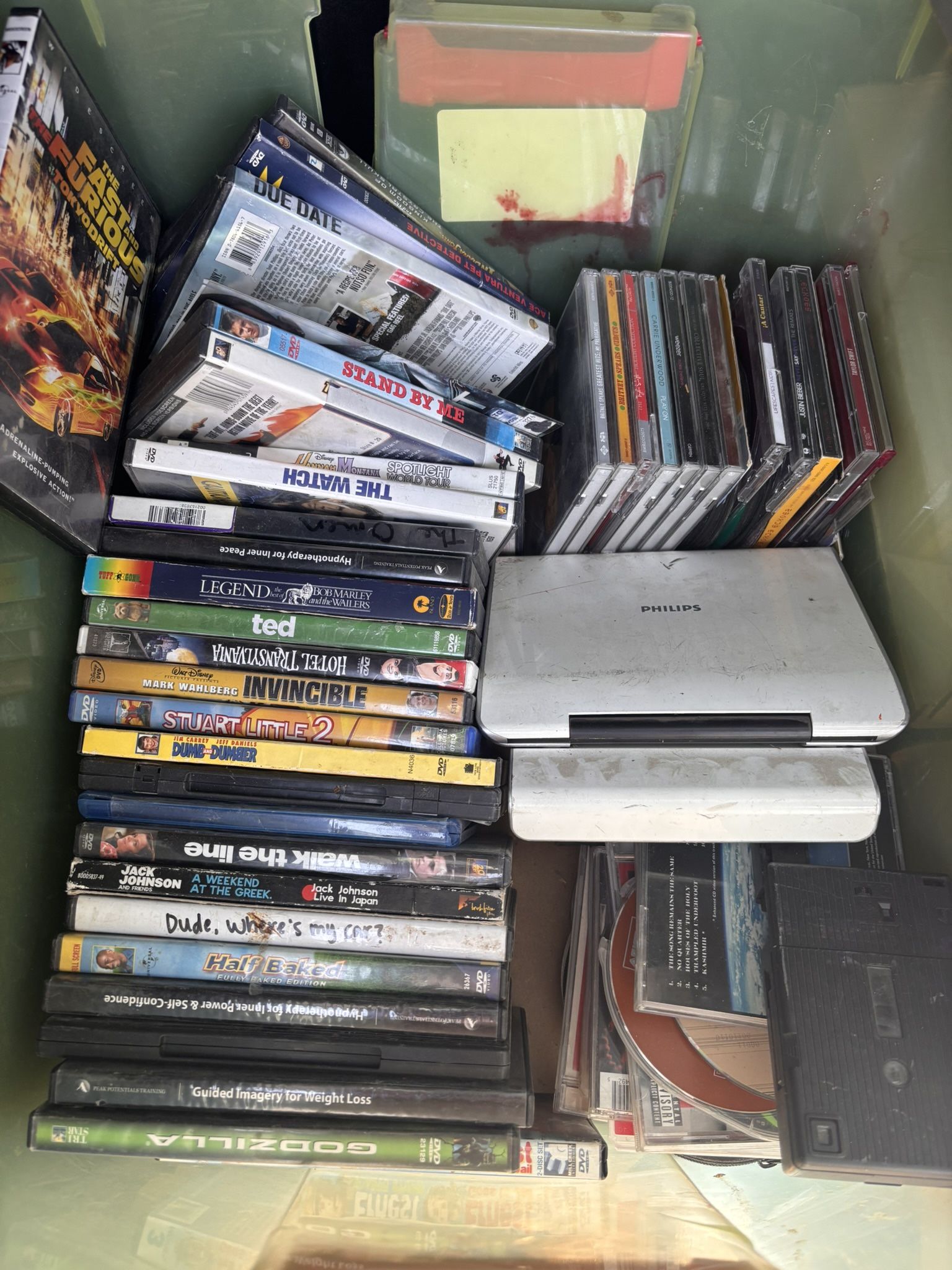 DVDs in folders but there is a lot. A lot of kids movies. Not sure which work but there are scratches on some yes. And I have a Phillips DVD player. Yes it works!! Rechargeable!
