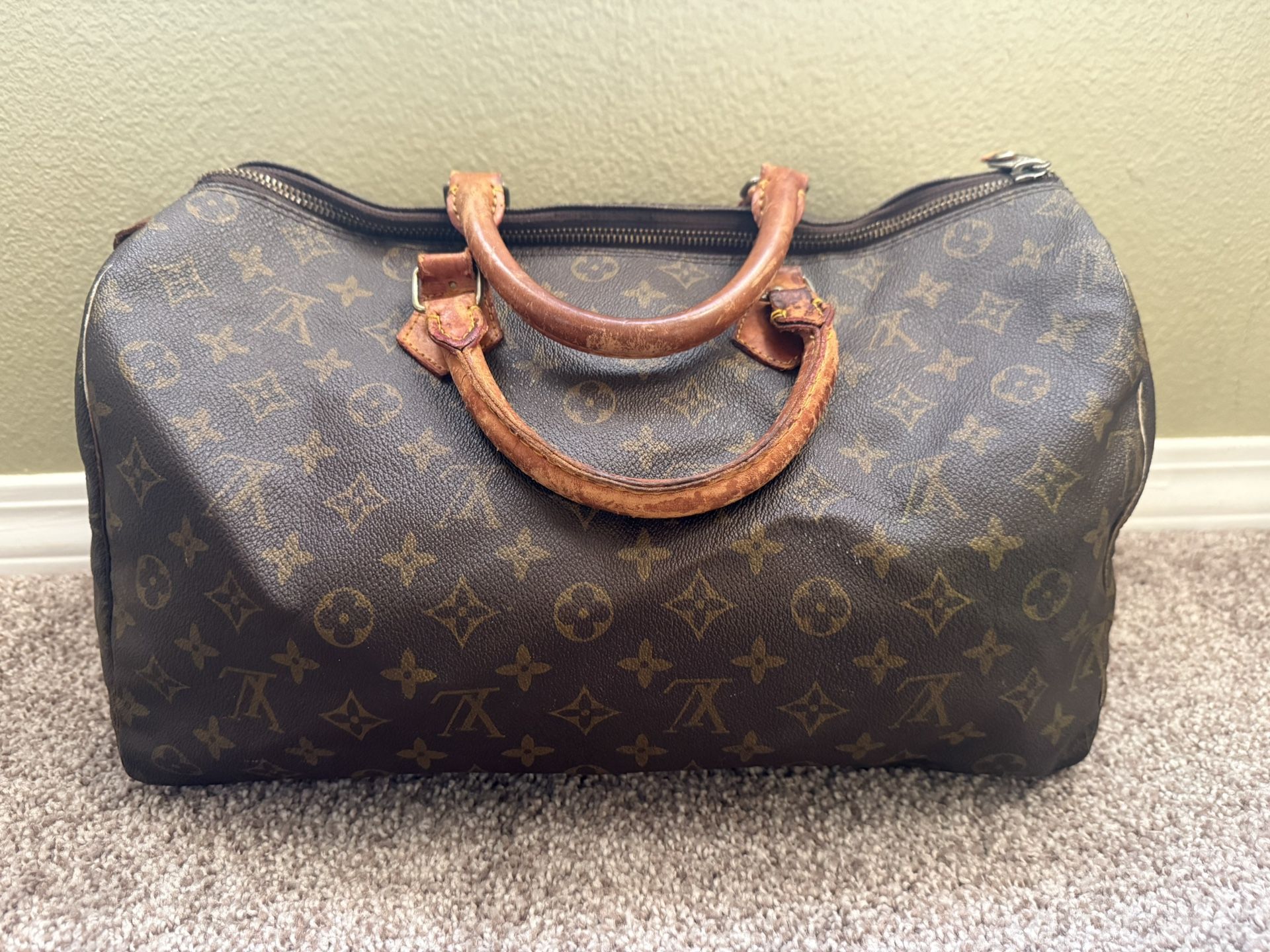 Vintage Louis Vuitton Speedy handbag in the classic monogram coated canvas. This iconic designer bag features natural leather handles, brass hardware, and the signature Louis Vuitton monogram pattern. Interior leather tag reads “Louis Vuitton Paris – Made in France.” This is a classic and timeless luxury handbag originally designed by Louis Vuitton and still sold today in updated versions. Condition Pre-owned vintage condition. • Monogram canvas in good structural condition