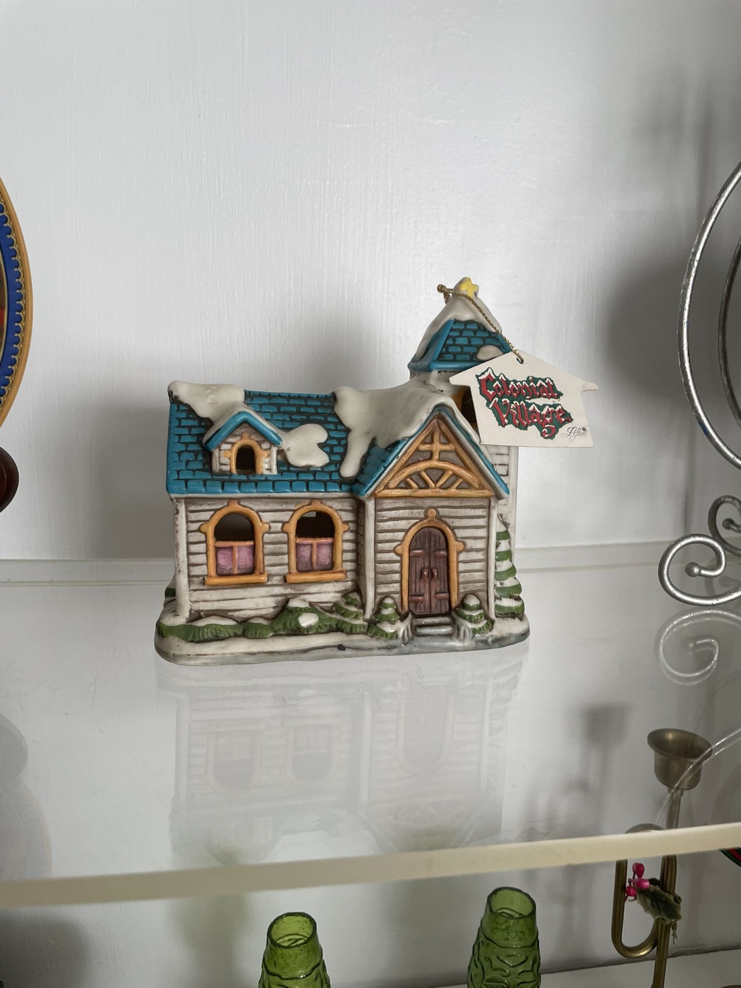 Vintage Lefton Colonial Village light-up Christmas house. Church/chapel style with blue roof, snowy details, and original Lefton hang tag — rare to find with the tag! ✔️ Authentic Lefton ✔️ 1980s Colonial Village series ✔️ Original bottom stamp + sticker ✔️ No major chips or cracks ✔️ Ready for LED or corded light (hole in back) Great for Christmas décor or collectors of vintage villages. Pickup only.