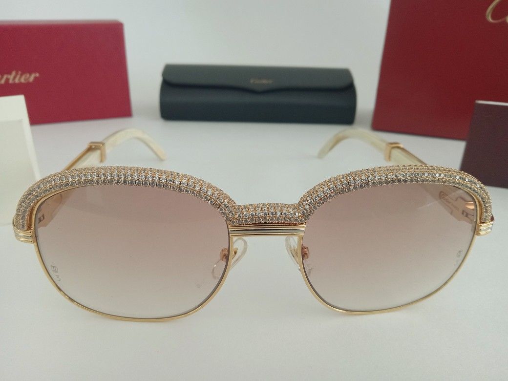Cartier white buffalo horn gold trim sunglasses with brown gradient tint lenses and white stones