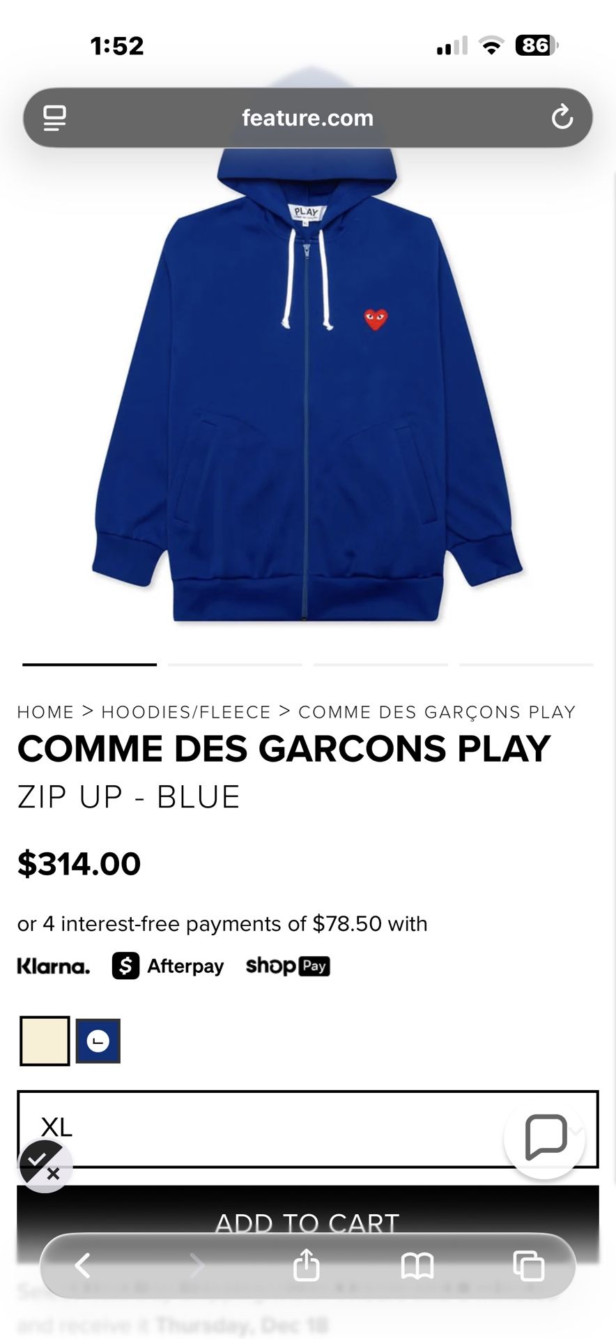 Comme des Garçons Play zip-up hoodie in blue. Classic heart logo on chest. Clean, minimalist look. Condition 8/10 • Size: XL • Condition: Gently used, no rips or stains • Full zip front • Thick, quality fabric – holds shape well
