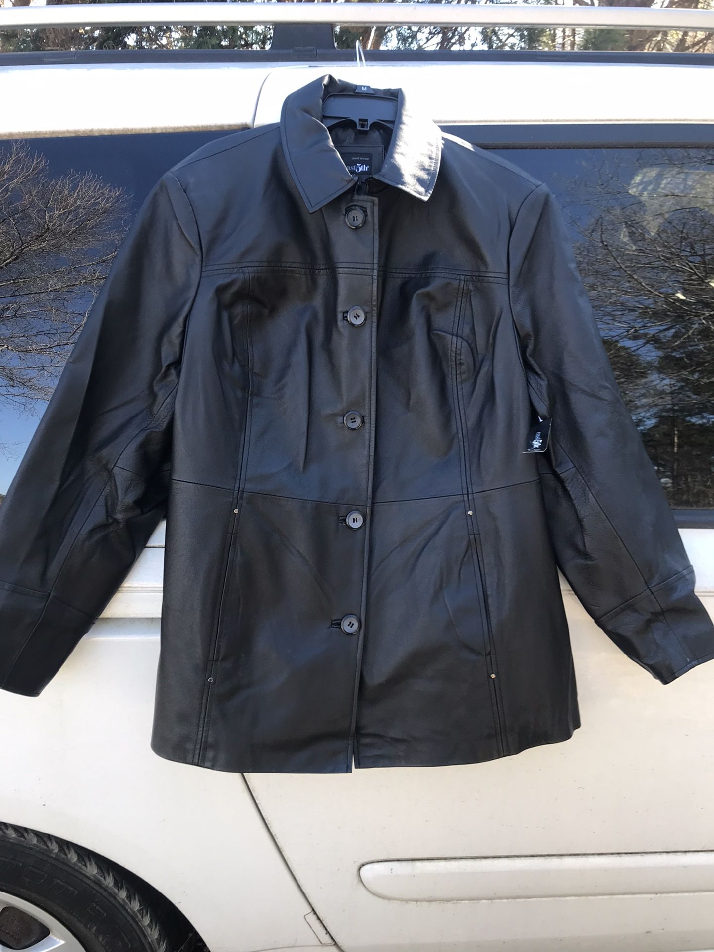 New with tags still on it , never worn . Genuine leather East 5th brand from JCPenney(says on tag ) . Size 3x / XXXL Original sticker/tag price is $220 . Nice jacket, all buttons attached and operating correctly. ON SALE MARKED DOWN !!!!! make best offer and reasonably please and its yours !