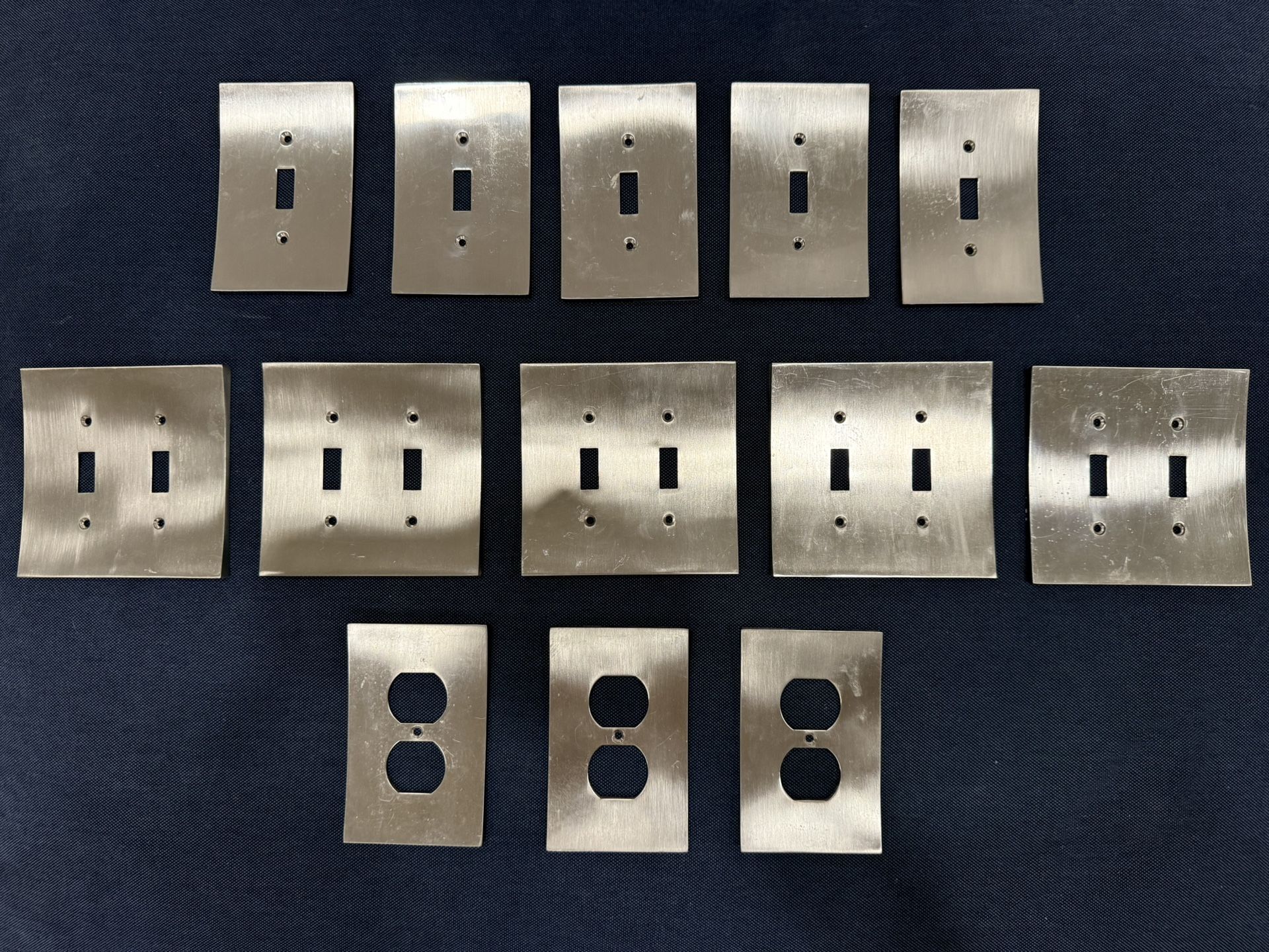 Brass with Satin Nickel finish with concave design. Similar in size and appearance to Amazon item pictured (same manufacturer). Hardware will be included for number of plates purchased. Pricing is as follows: — Everything - $40 — Double Toggle Switch Plates - $5 each ($20 for all) — Single Toggle Switch Plates - $3 each ($12 for all) — Outlet Cover Plates - $4 each ($10 for all)