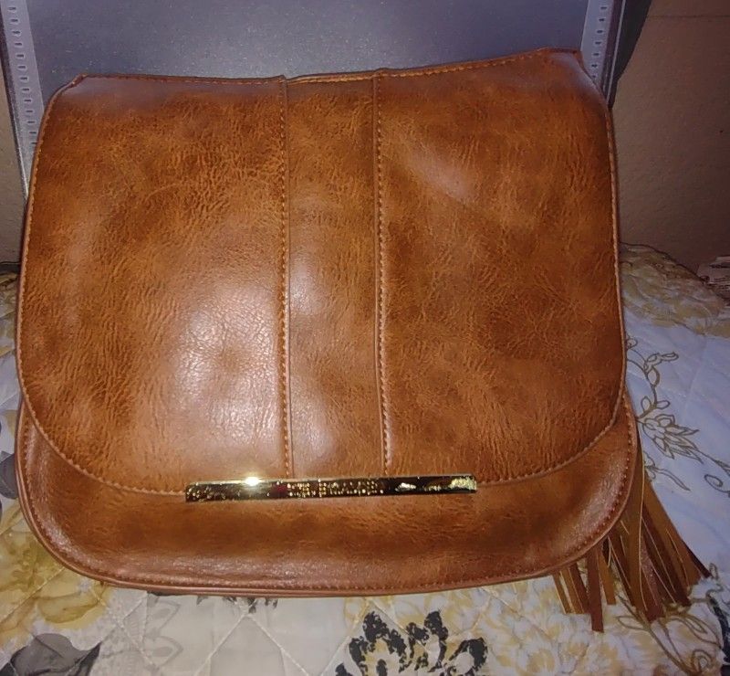 Steve Madden Saddle Bag Purse Leather made out of leather color is cognac brown Strap is a gold chain